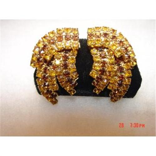 WOW!! I stopped counting after 50, rhinestones per earring. There is well over 100 amber, citrine colored rhinestones is this lovely pair of clipped earrings. This is designer quality. Each stone is carefully hand placed and held firmly intact by individual prongs. Excellent condition. These are 1 1/2 inches tall