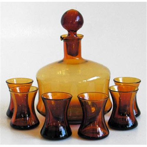 Produced in lovely honey amber glass by one of the superb West Virginia Glass Companies, around the 1960s - we believe. Outstanding styling - the decanter features a small spout, a ball stopper and the middle gently convexes. The SIX matching tumblers are all similarly indented, like the decanter, and have a flared rim. The decanter stands 7 inches tall including its ball stopper - the tumblers are all 2 1/4 inches tall. The bottom of the stopper is not flat but does not appear to have any damage, otherwise all eight pieces are in excellent condition.