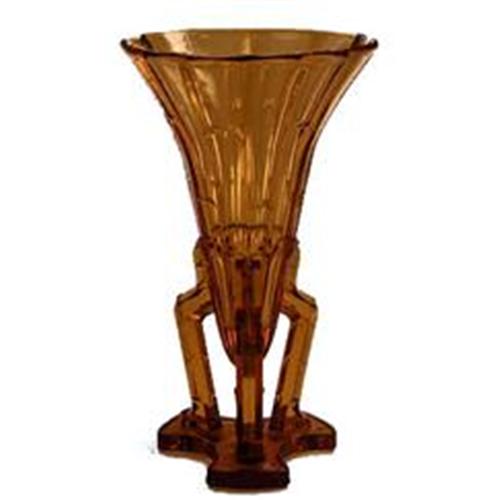 Produced in Czechoslovakia circa 1930 this deep amber Depression era glass Art Deco Rocket vase features three Machine Age designed legs and a panel optic conical vase. Measuring about 6 1/2 inches tall and is in excellent condition for its age.