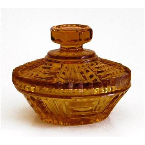 <table width="100%" border="0" cellspacing="0" cellpadding="4"><tr><td><em> </em></td></tr><tr> <td width="100%"> This lovely amber Depression glass dresser jar features an Art Deco geometric design with a herringbone pattern, an eight sided finial and a sawtooth edged rim on the lid. This jar is one of the smaller dresser jar that was part of a vanity set. This beautiful Art Deco pressed amber Depression dresser jar measures 3 1/4" tall x 4" across the rim is in excellent condition. </td></tr><tr> <td> </td></tr><tr> <td>Reference #: tsAADDGPJ1</td></tr><tr><td>Condition:Excellent</td></tr><tr><td>Year:1930s</td></tr><tr><td>Title:Amber Depression Glass Art Deco Powder Jar 1</td></tr><tr><td>Location:Orlando, Florida</td></tr></table>