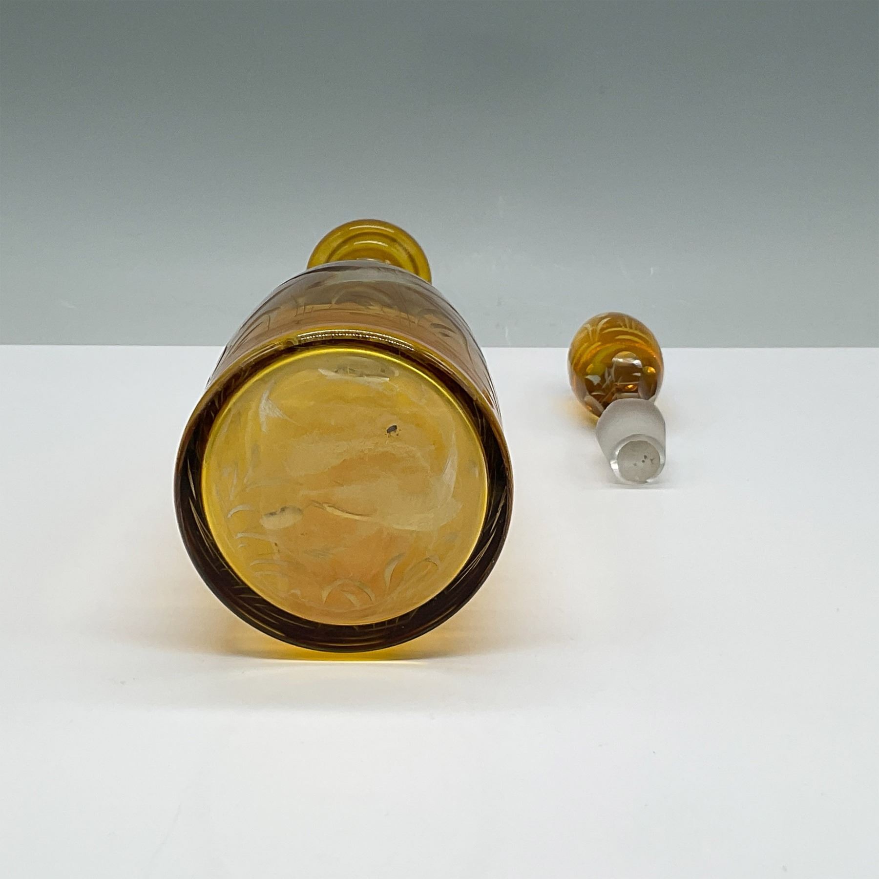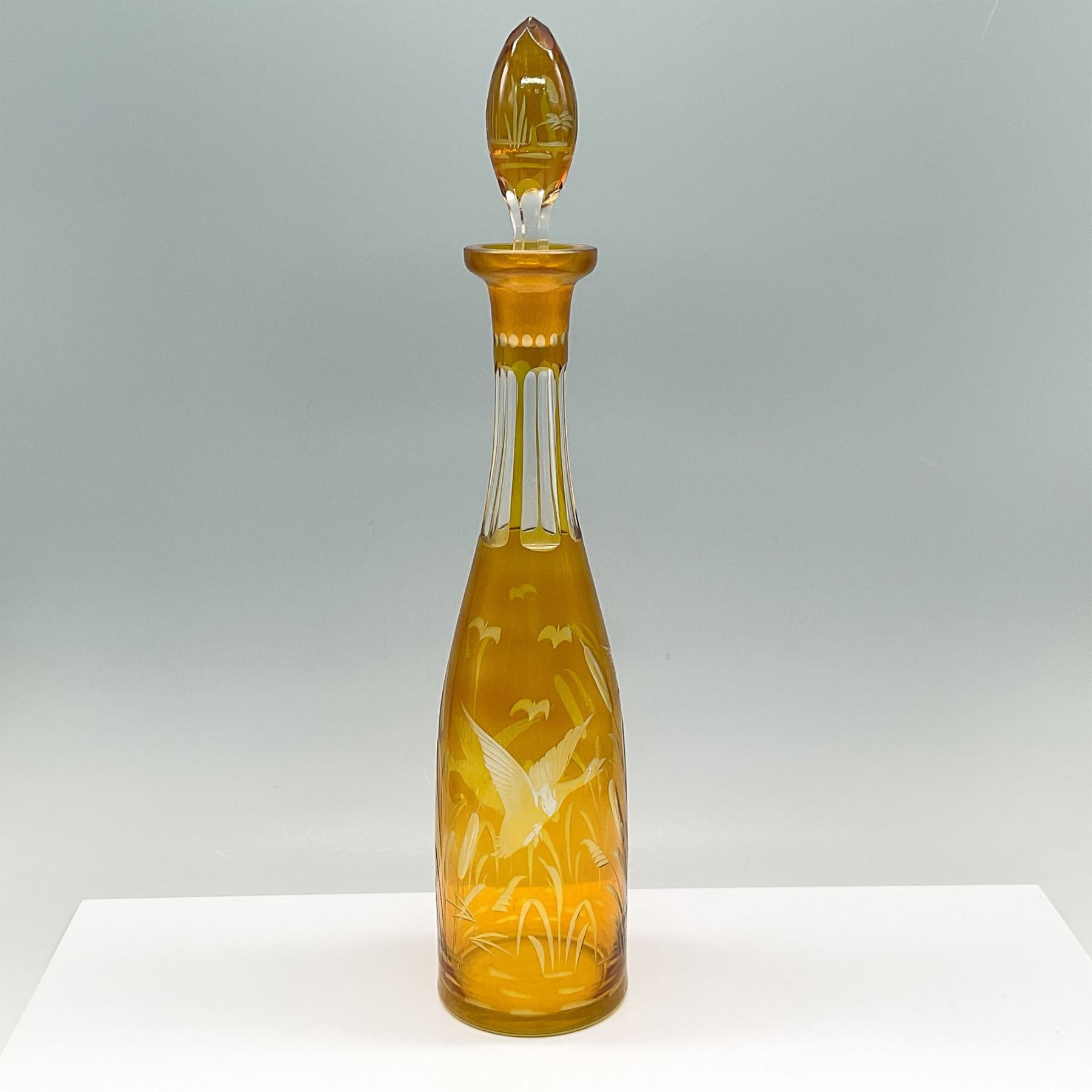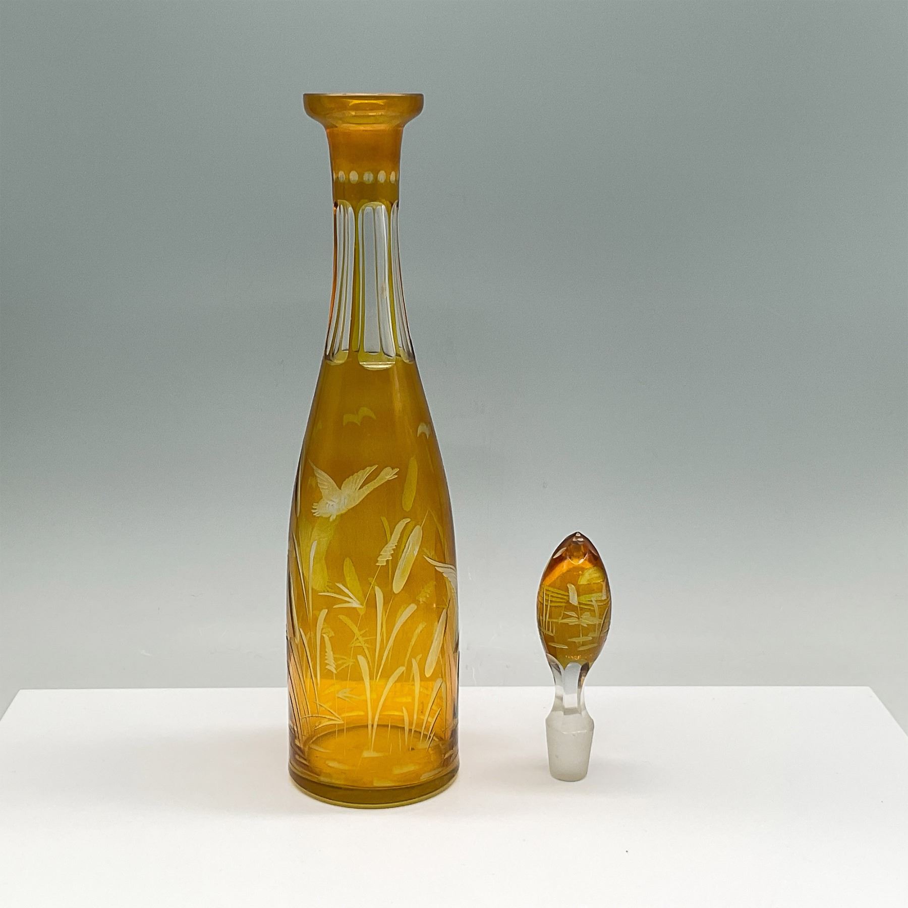 Elegant amber glass decanter featuring a finely etched design of a crane amidst reeds and foliage, complemented by additional decorative accents. The decanter includes a matching glass stopper with intricate etching to coordinate with the bottle's design. The craftsmanship suggests high attention to detail, making it a standout decorative piece or functional barware.