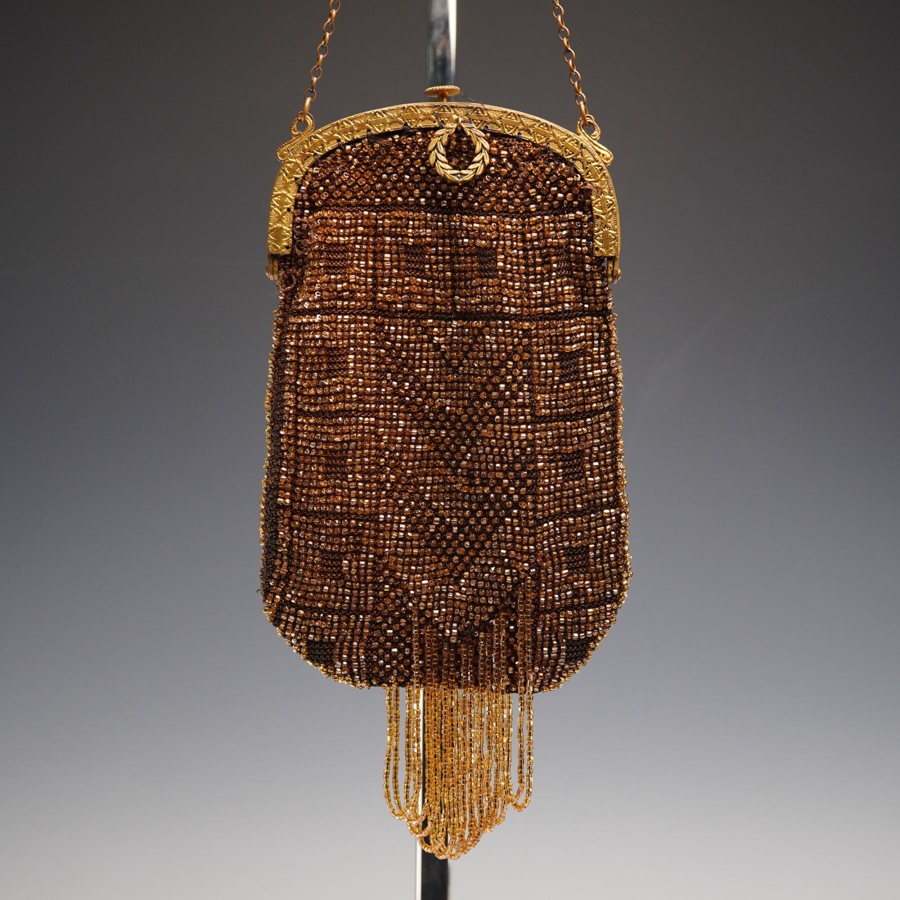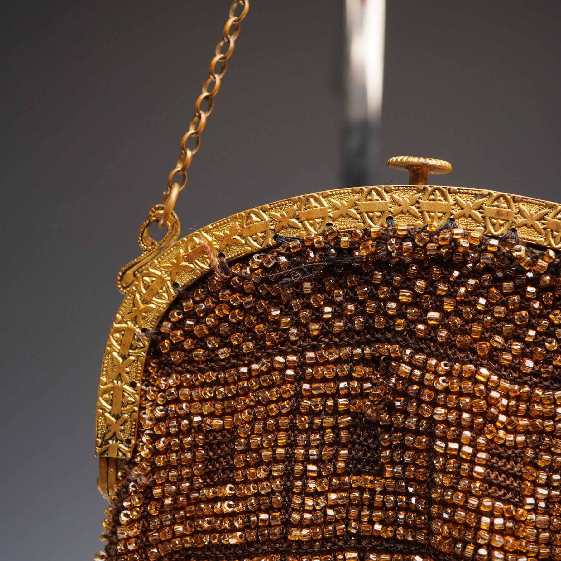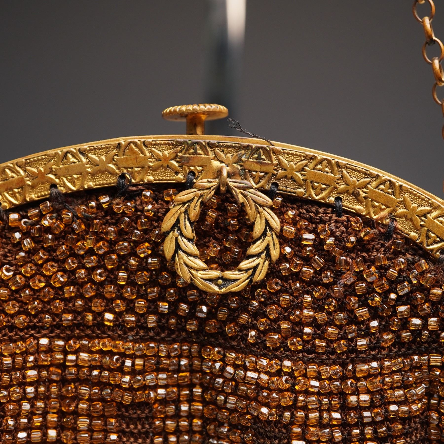 Beautifully detailed, this purse is crafted with warm amber-toned glass beads arranged in a striking geometric design. The body gathers into a long beaded fringe that moves gracefully, adding texture and shimmer. Its ornate gilt frame is highlighted with floral and star motifs and centered with a laurel wreath clasp, paired with a matching chain handle for ease of carrying. A stylish and richly colored purse that blends artistry and elegance in a timeless accessory.