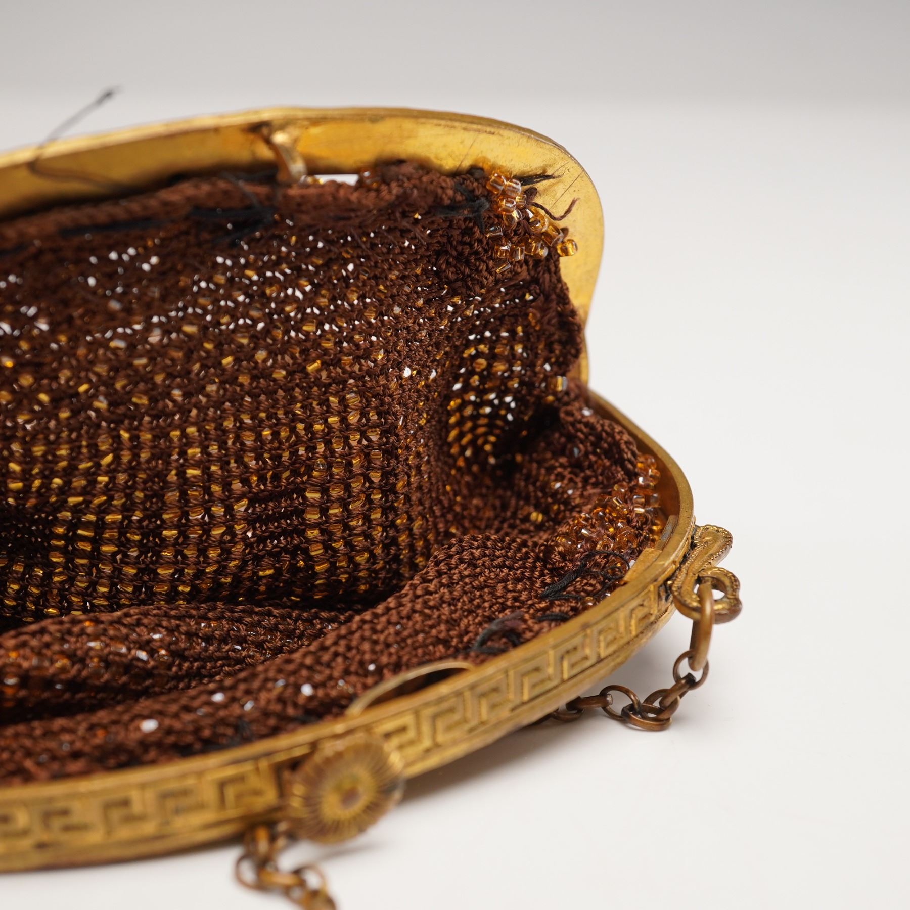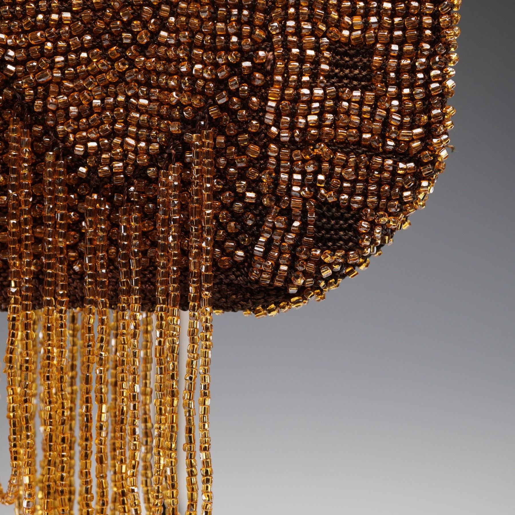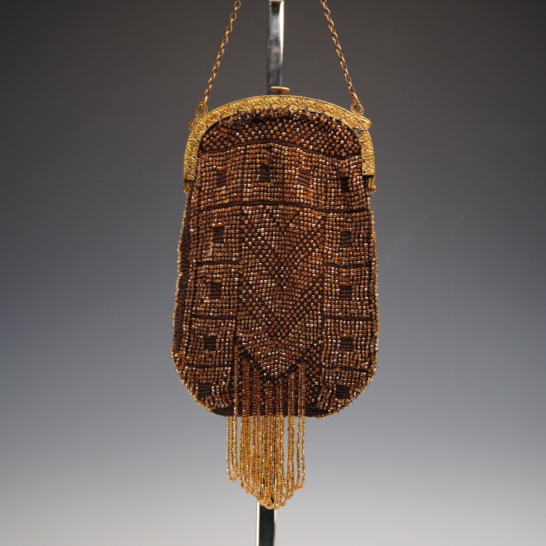 Beautifully detailed, this purse is crafted with warm amber-toned glass beads arranged in a striking geometric design. The body gathers into a long beaded fringe that moves gracefully, adding texture and shimmer. Its ornate gilt frame is highlighted with floral and star motifs and centered with a laurel wreath clasp, paired with a matching chain handle for ease of carrying. A stylish and richly colored purse that blends artistry and elegance in a timeless accessory.