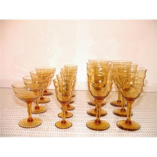 These amber stems are just spectacular. I don't know the maker, but I do know they are of fine quality. One of the prettiest sets I've ever seen. Includes 4 champagne/sherbets, 5 cordials, and 5 wine or water goblets. No nicks, chips or cracks. Gorgeous!