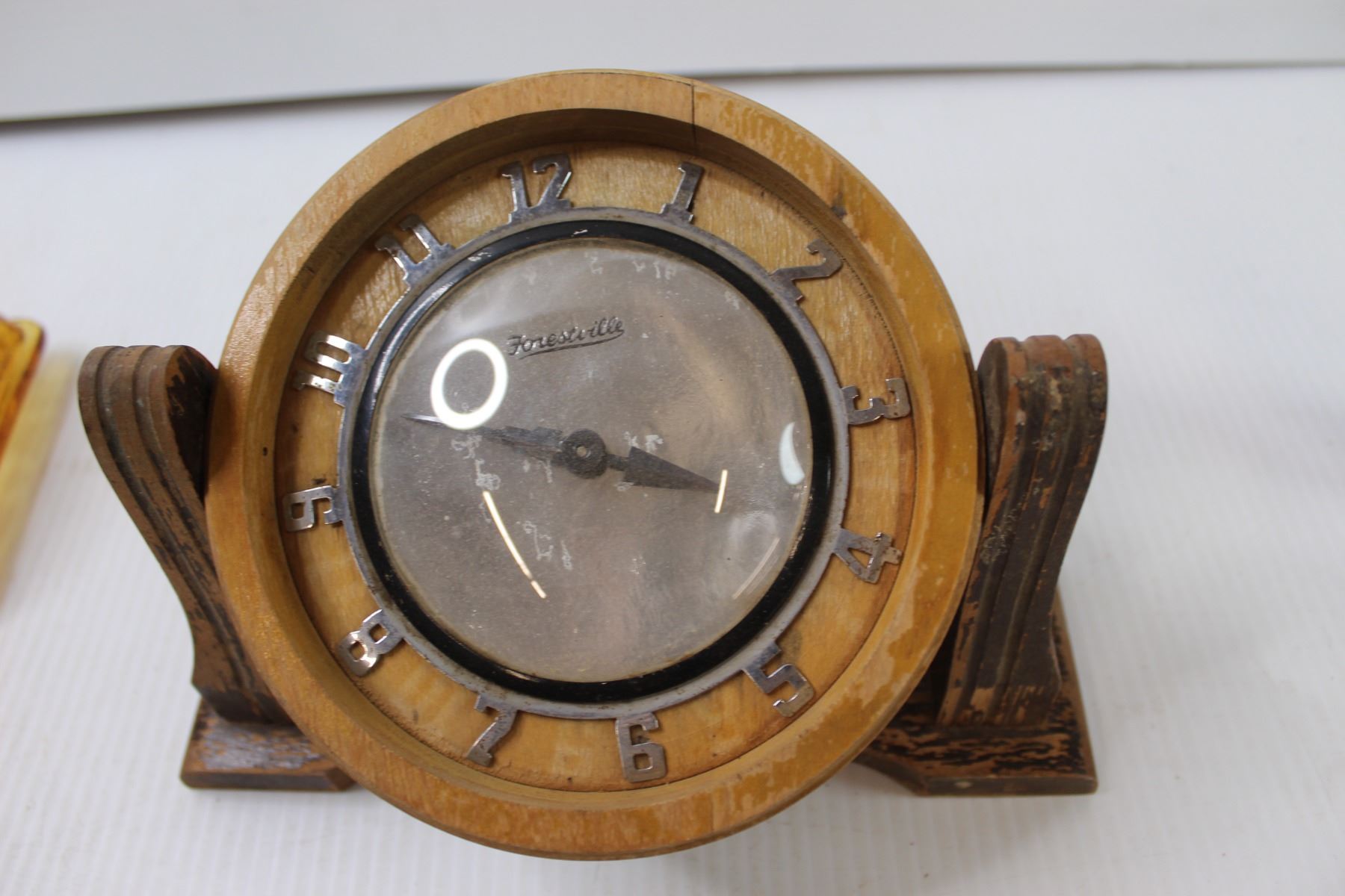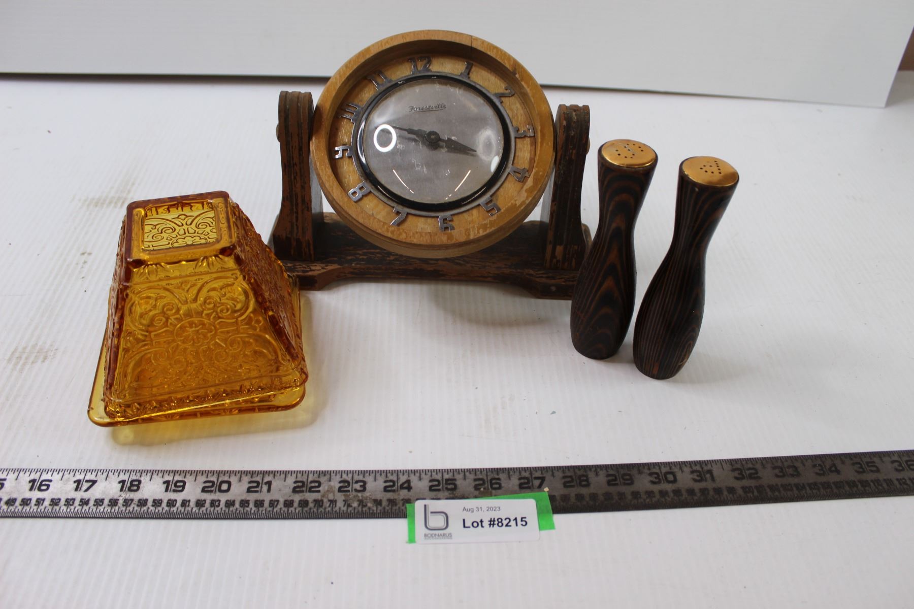 Amber Glass Candle Holder, Wooden Clock and Salt and Pepper Shakers