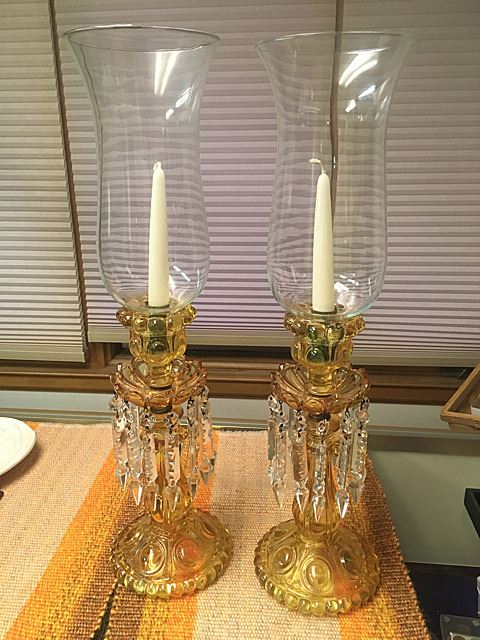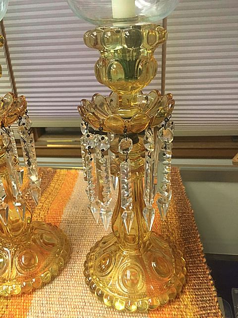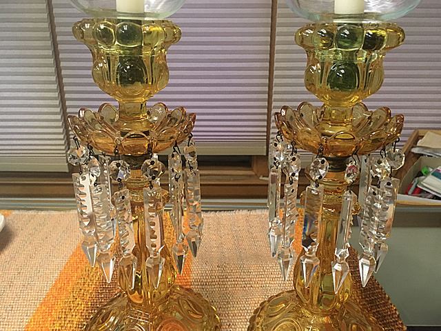 Pair of amber glass girondole candle holders with prisms and hurricanes