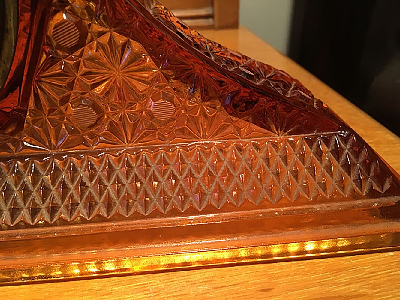 Nice amber glass, pressed glass with diamond pattern, etched flowers, very nice amber glass clock. Measures approx. 6 1/4" high x 14 1/2" wide x 3" deep.