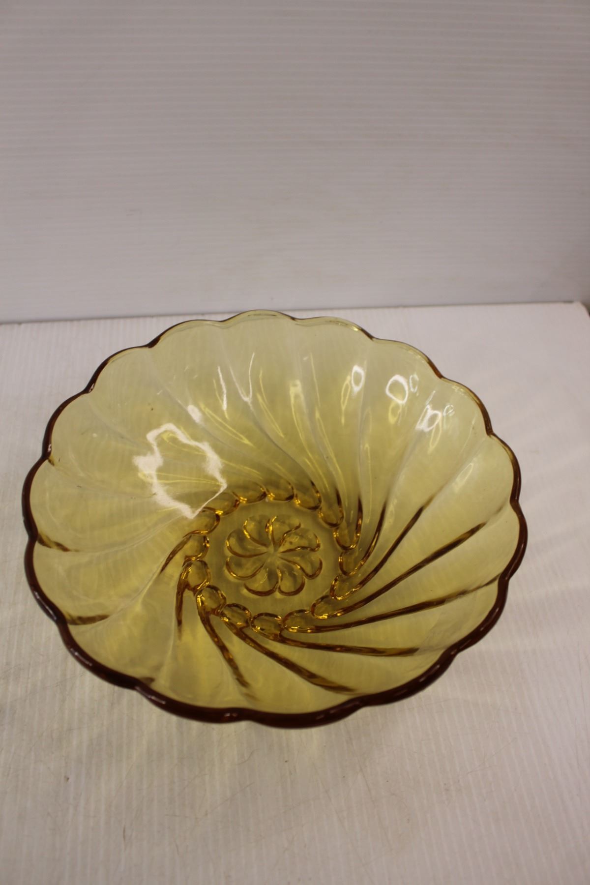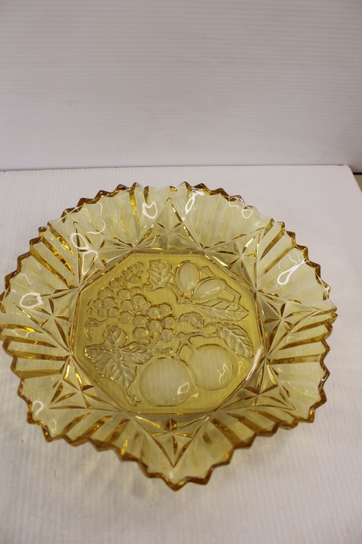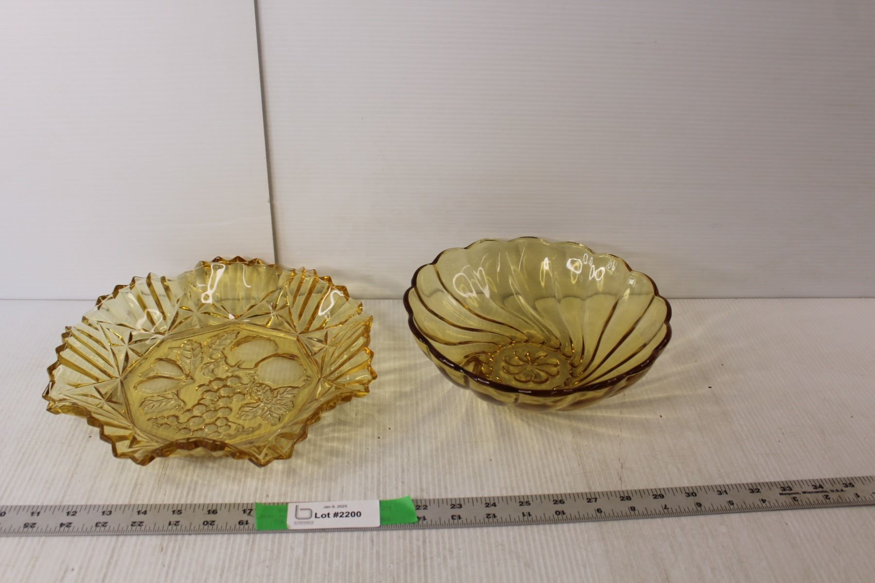 Amber Glass Ruffled Pressed Glass Fruit Embossed Serving Bowl and Amber Glass Colonial Swirl Chip Bowl