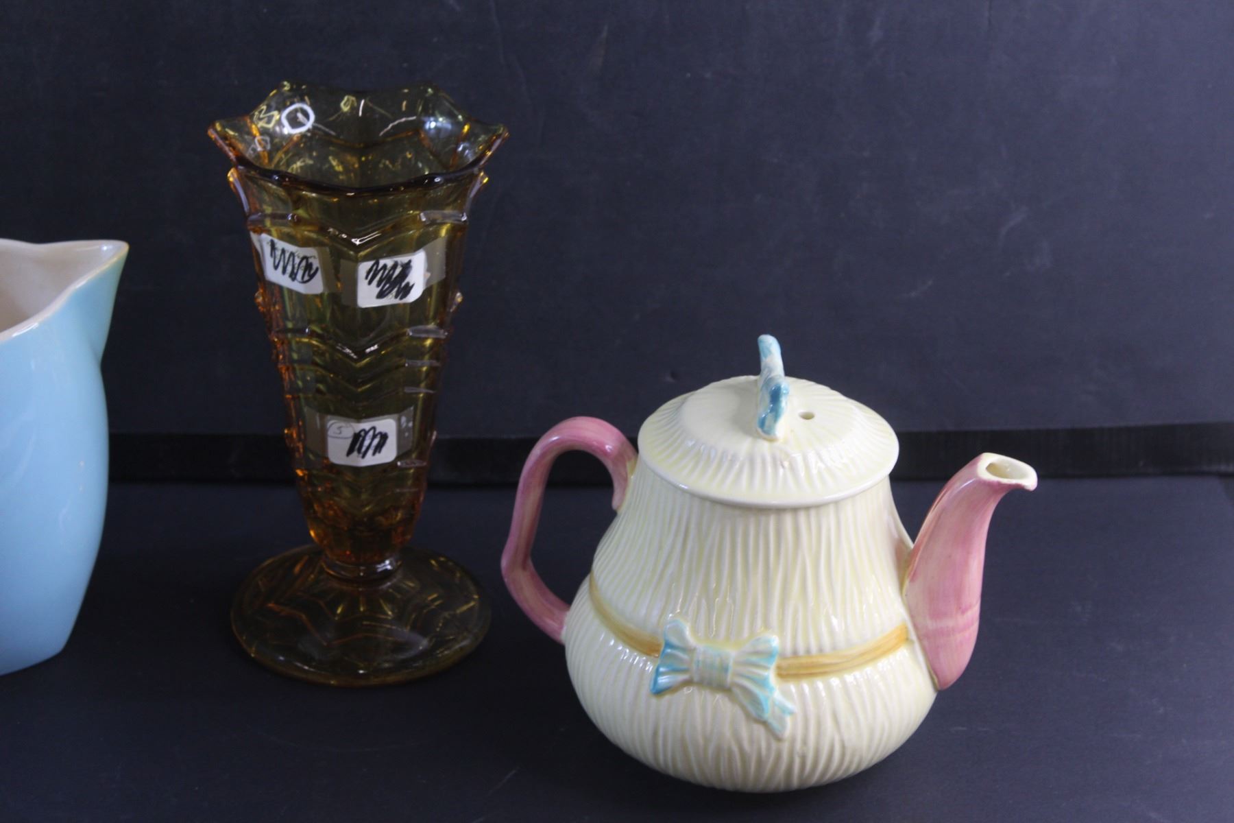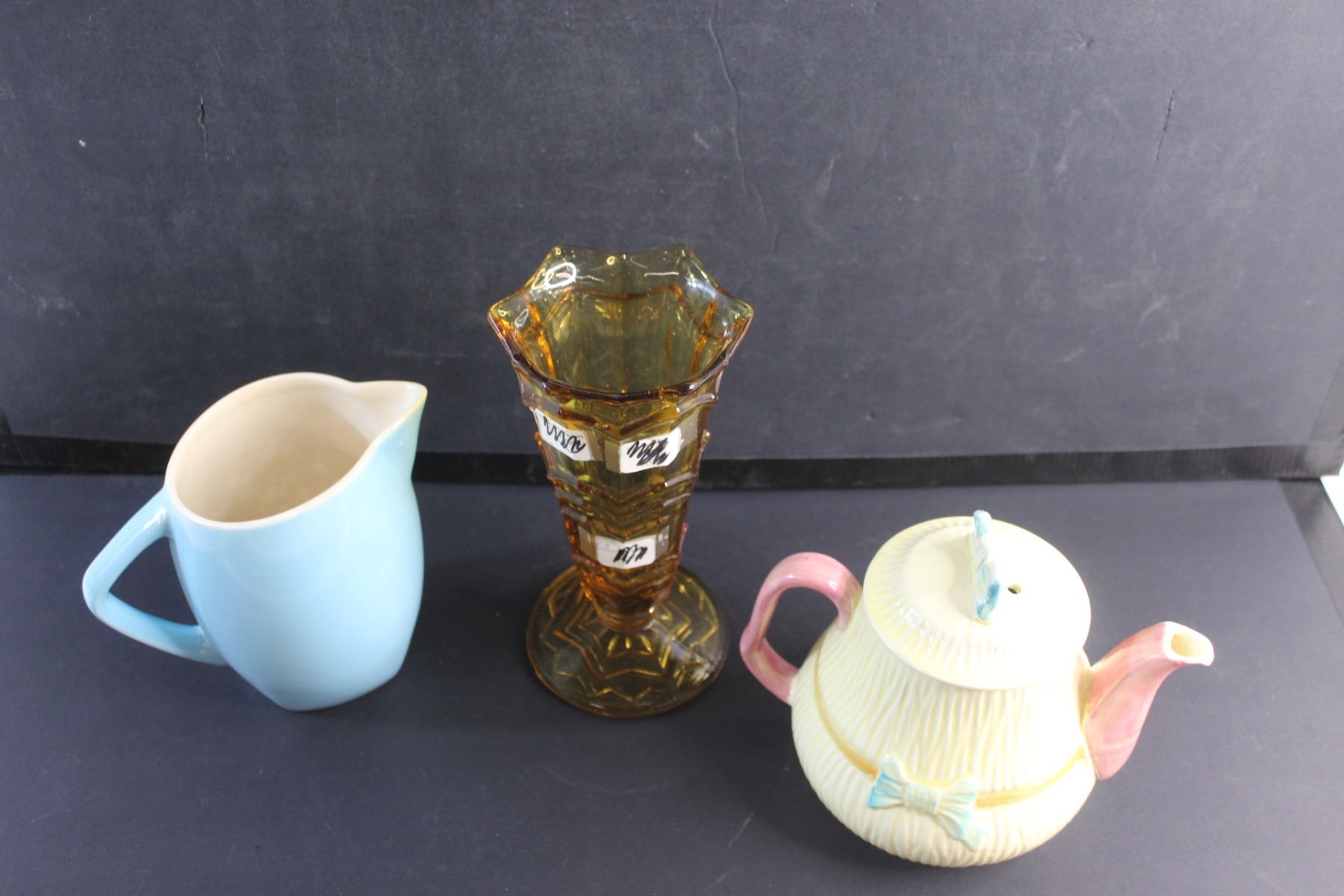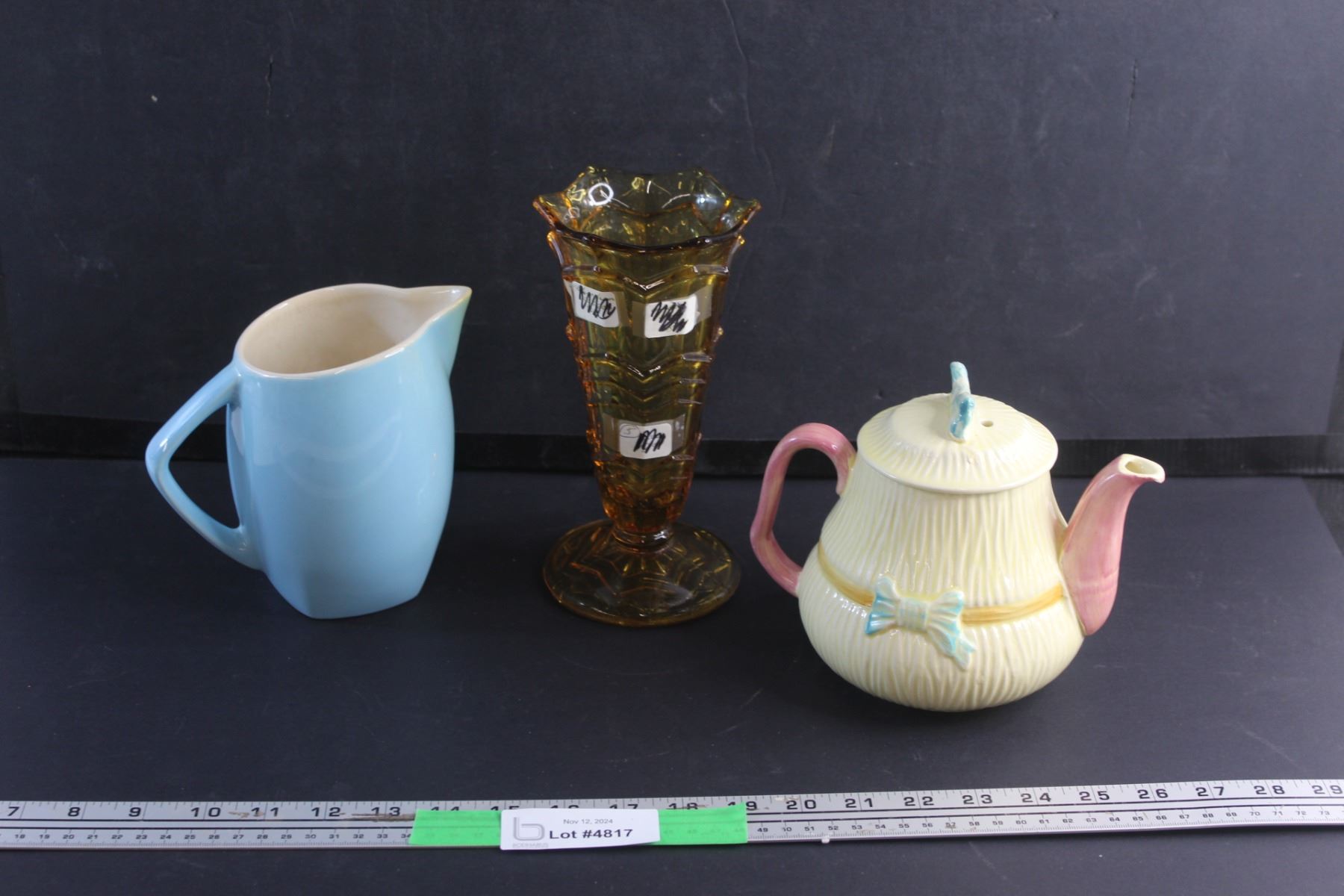 Amber Glass Vase, Ceramic Pitcher and a Tea Pot