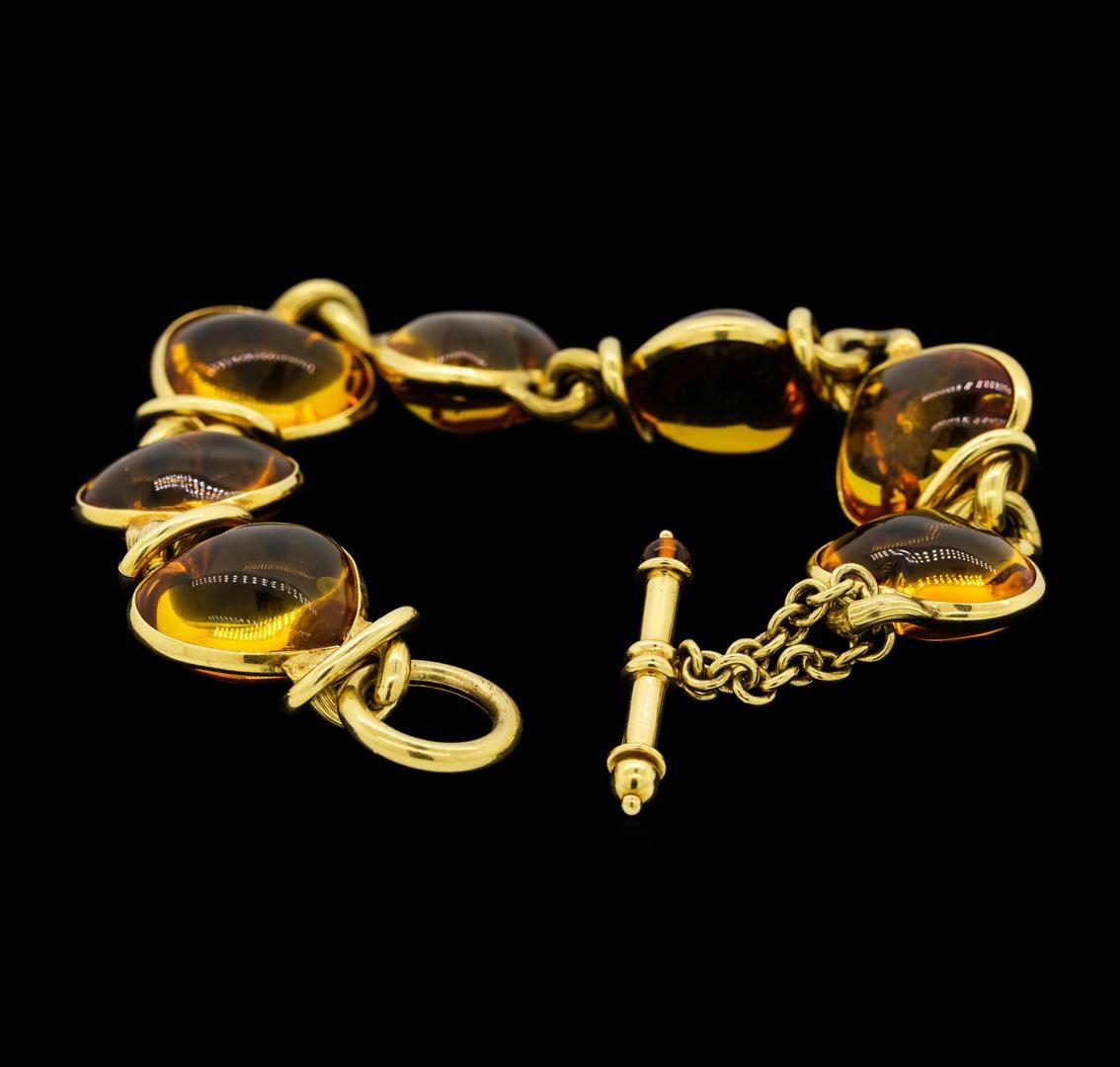 One suite electronically tested 18KT yellow gold lady's combination cast & assembled fashion heart shape pendant and bracelet with a toggle clasp with a bright polish finish. The featured lady's suite contains one heart shaped amber pendant with an attached gold bail and one bracelet with seven heart shaped amber motifs. All of the heart shaped amber pieces are cut into a double cabochon. Identified with markings of '750'. Condition is like new, good workmanship.. Total Weight of Pendant And Bracelet 41.30gm GAS Appraised at $1,800.00.