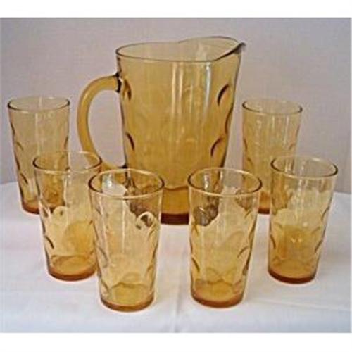 Vintage amber pitcher & glasses in the Polka Dot (inverted coin dot)pattern. These are definitely reproductions, but the pattern dates from 1884 when first introduced by Hobbs. The pitcher and glasses are in excellent condition, color is great.