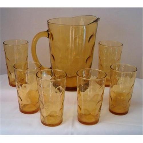 <table width="100%" border="0" cellspacing="0" cellpadding="4"><tr><td><em> </em></td></tr><tr> <td width="100%"> Vintage amber pitcher & glasses in the Polka Dot (inverted coin dot)pattern. These are definitely reproductions, but the pattern dates from 1884 when first introduced by Hobbs. The pitcher and glasses are in excellent condition, color is great. Order three of anything that we can ship in one container, pay with PayPal and shipping is FREE...
