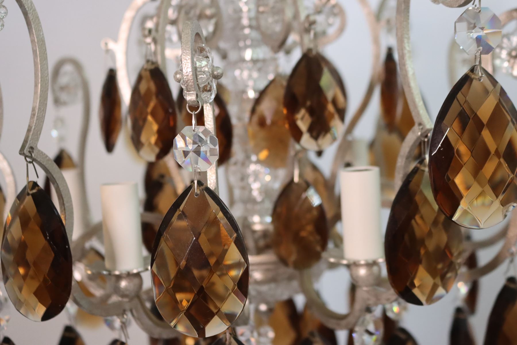 Exquisite and elegant chandelier comprised of amber colored crystal tear-drop prisms, smaller clear prisms, all surrounding a clear center crystal globe, six taper lights and twelve decorative brushed aluminum metal scrolls. Excellent condition.