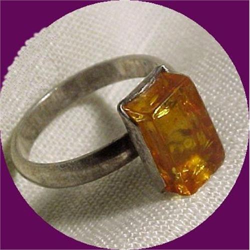 Unusual Rectangle Cut Amber set in a Sterling Silver Ring. The ring is a size 5. There is some debris in the amber. The amber stone is 7/16" long & 3/16" wide. <p> The condition is excellent. <p>