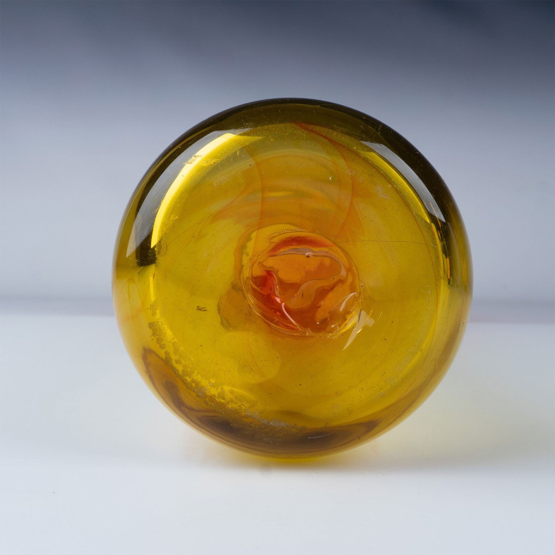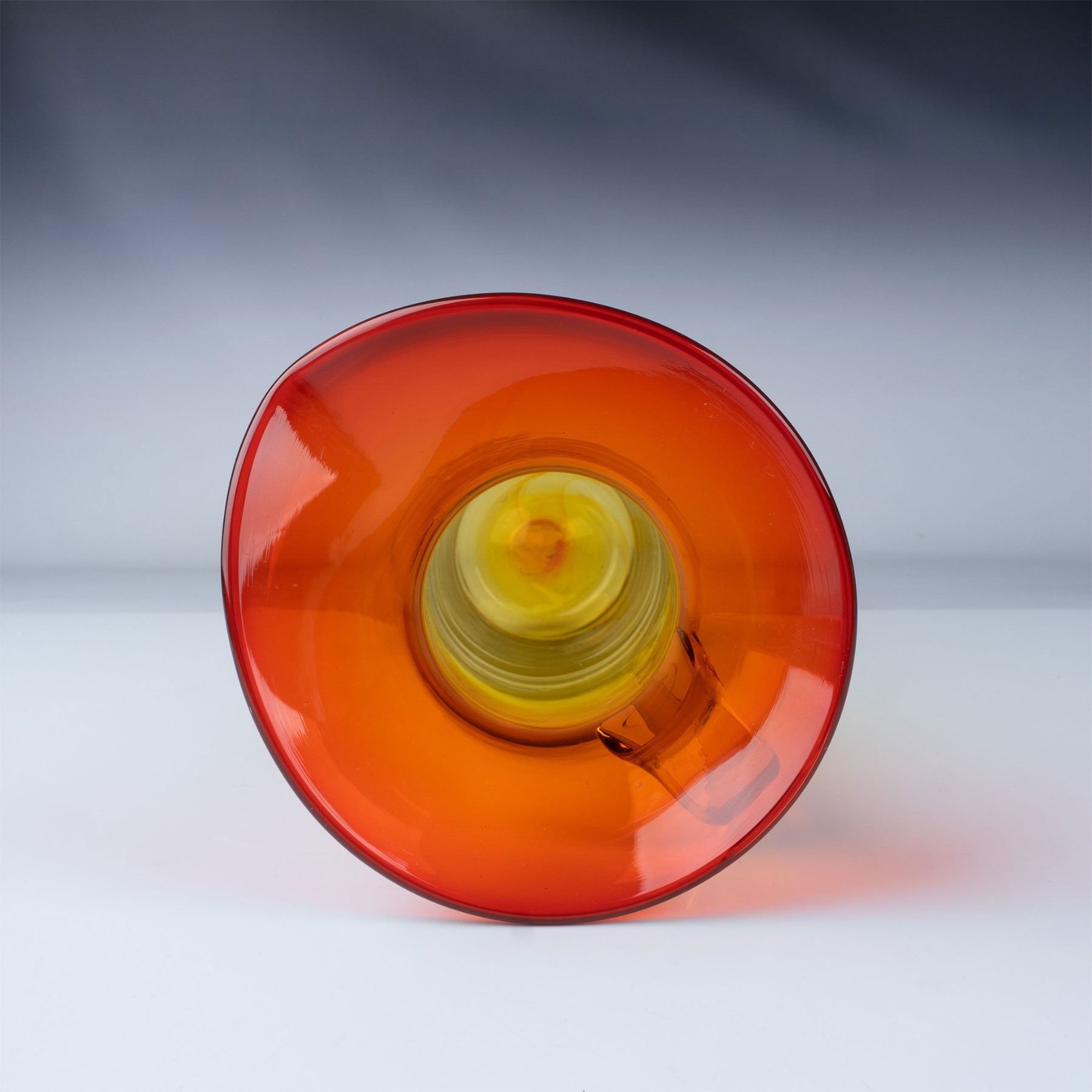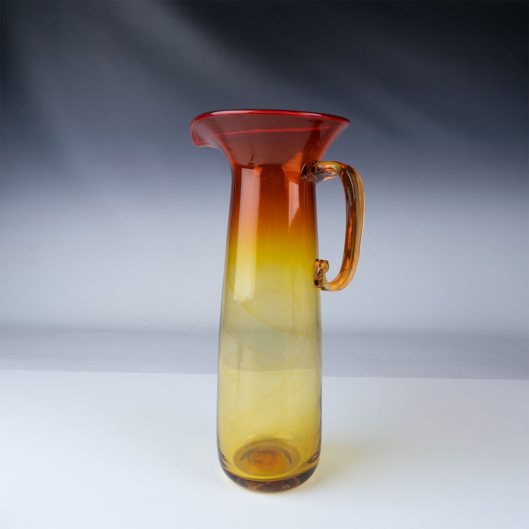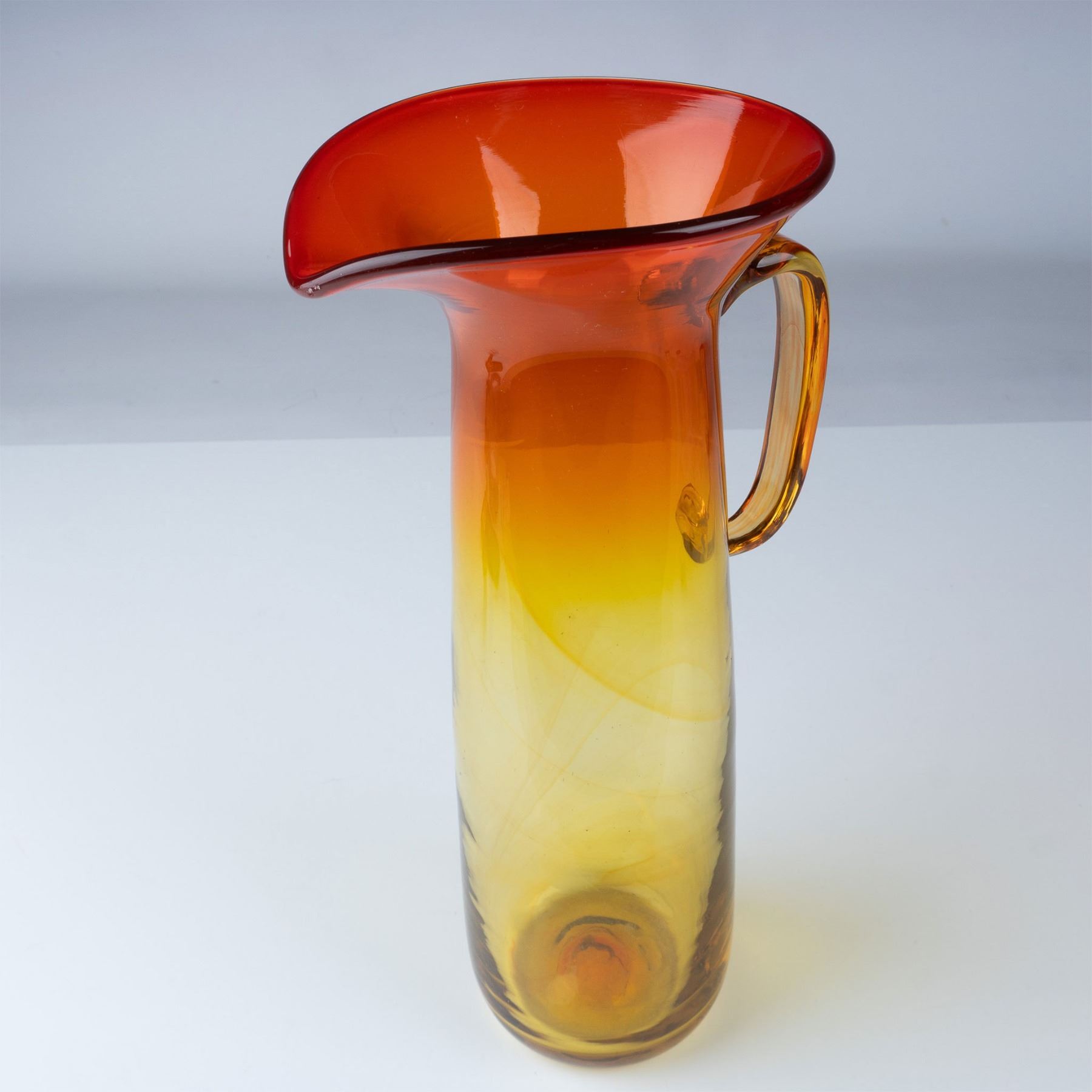 This stunning hand-blown glass pitcher features a captivating amber and yellow gradient design. The pitcher is crafted with a curved, clear handle and a wide, flared rim. Its unique coloring transitions smoothly from a rich orange hue at the top to a soft yellow at the base, creating a beautiful visual effect. The craftsmanship of the pitcher highlights the artistry of the glassmaker, with no visible signature or markings, allowing the design to speak for itself. A perfect addition to any glass collection or as a standalone decorative piece.