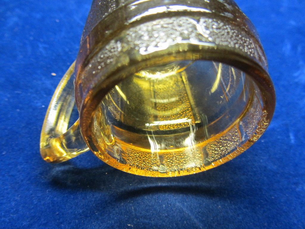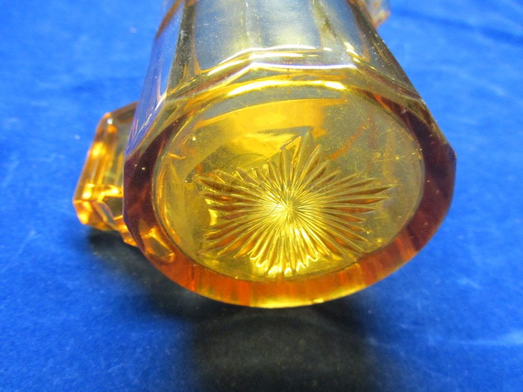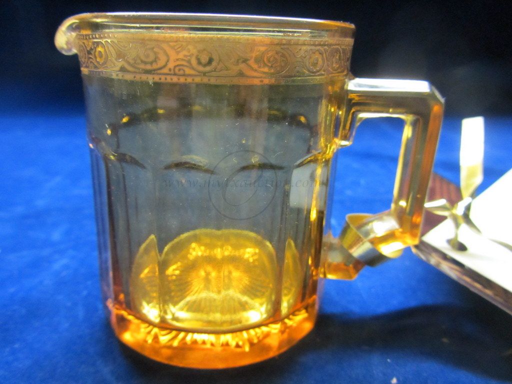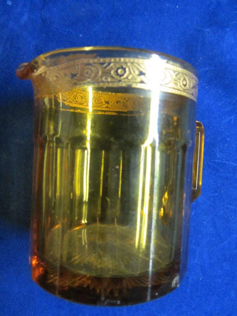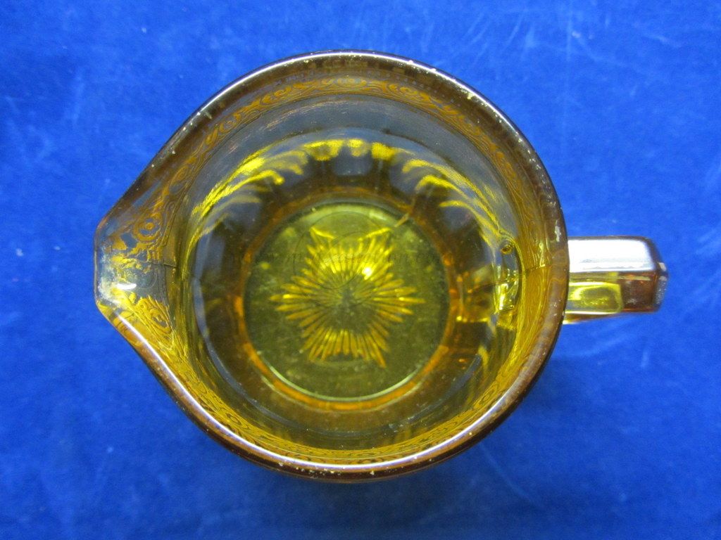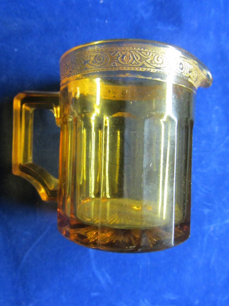 Beautiful late 1940's/early 50's amber ware pitcher used for cream or syrup this piece is in exceptional condition for its age. There is normal ware on the gold gilding etching around the top edge, great color perfect for the breakfast table.