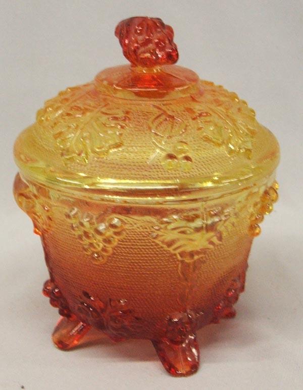 Amberina Glass Grape Pattern Covered Bowl. Measures 5.75''Hx4.5''W. SHI $20.