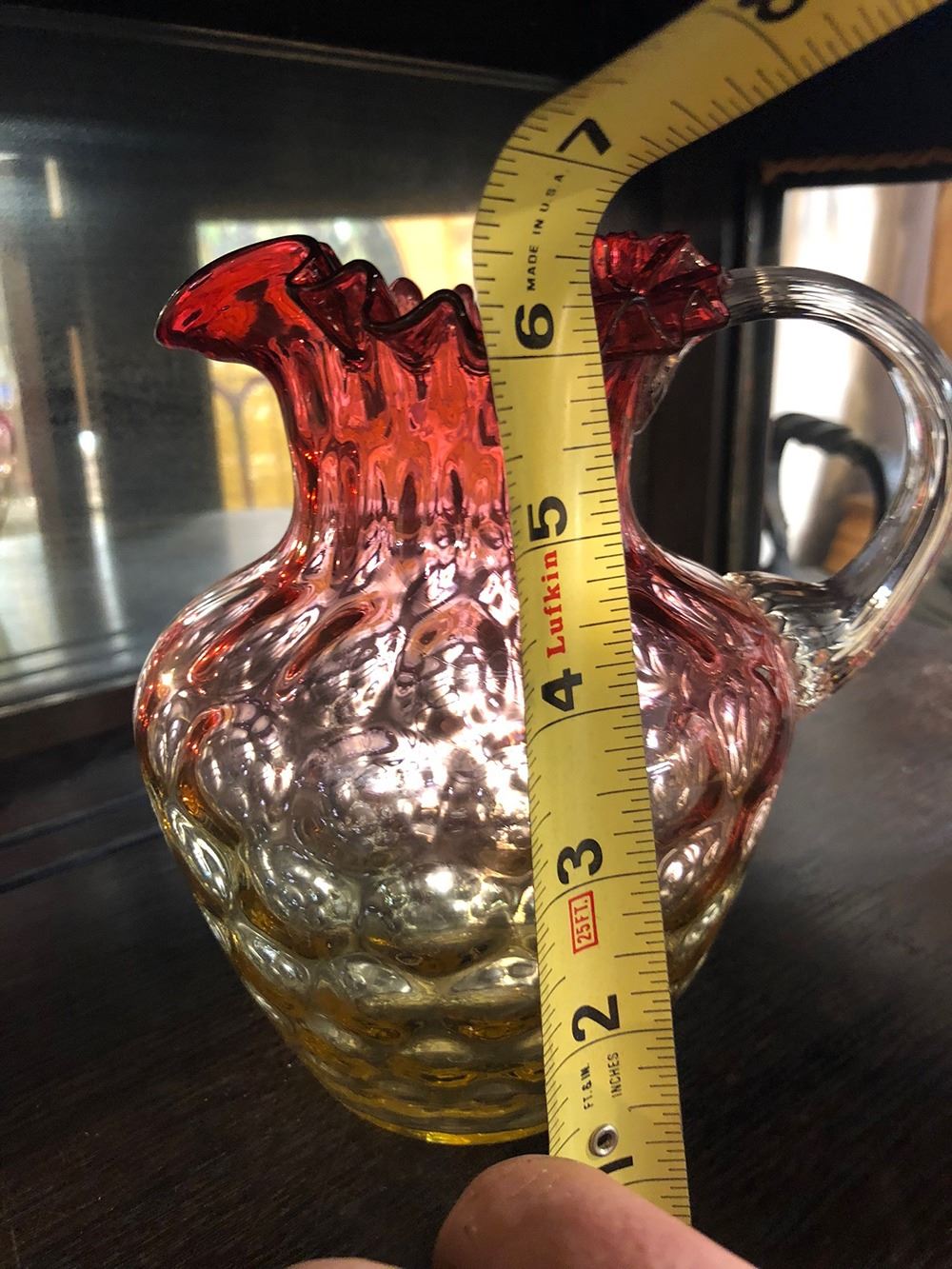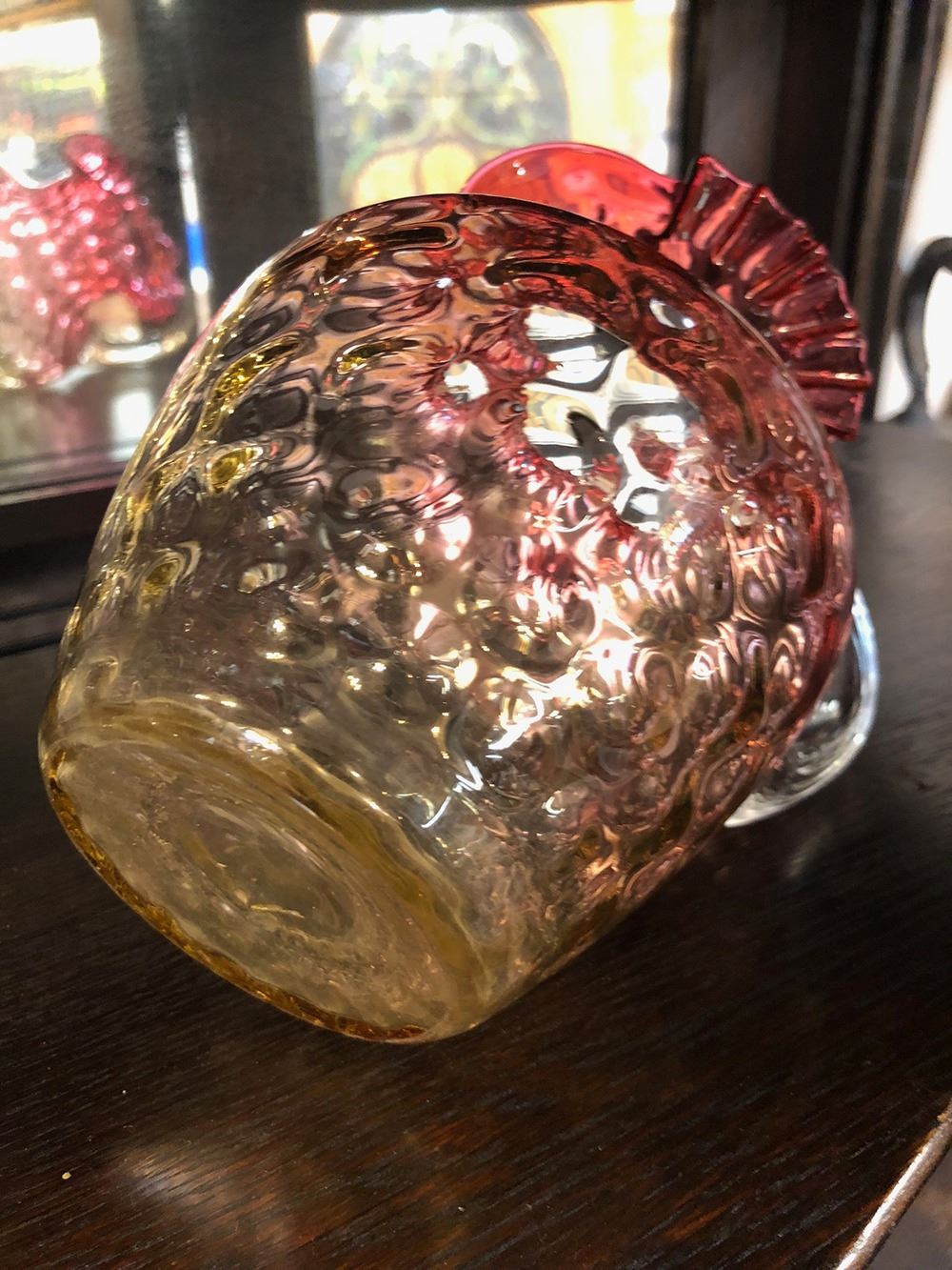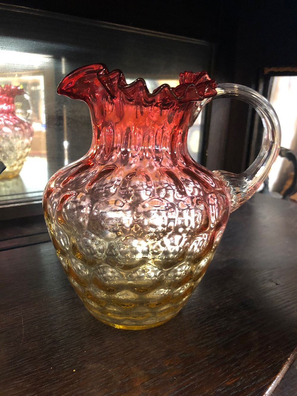 Amberina Glass Inverted Dot Pattern Pitcher with ground pontal water pitcher, measures approx. 6.5” tall