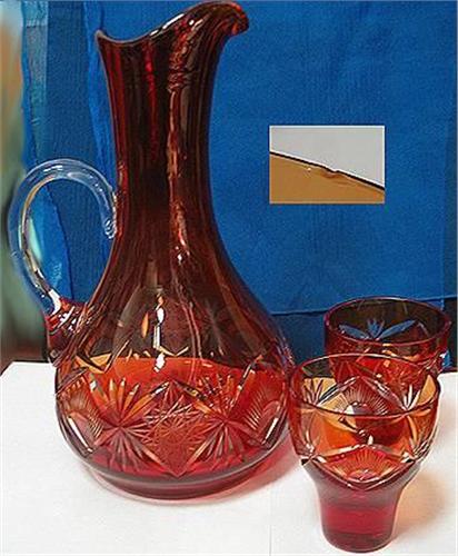 Amberina flashed wheel cut rose cut pitcher standing 10 1/2" tall. Some very small chips to design, clear applied glass handle. With two matching wheel cut rose cut tumblers standing 3 1/2" tall. One has a rim chip. A well made set