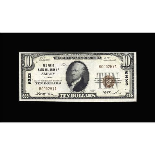 <B>Amboy, IL</B></I> - $10 1929 Ty. 1 <B>The First NB</B></I> Ch. # 5223<BR>H.H. Badger and F.N. Vaughn saw the demise of this bank on October 2, 1934, leaving behind this <B>Very Fine+</B></I> $10 plus four other small size notes already enumerated in the census. A tight top margin is noticed.