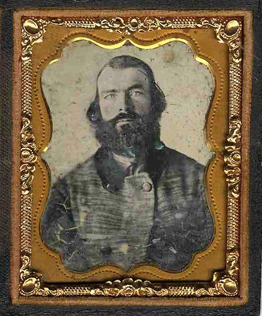 Ninth-plate ambrotype of a male civilian in a homespun, double-breasted coat with a dark wool collar and fabric-covered buttons. His face is framed by a shock of long curls and a very thick beard. The image is very clear with the exception of some minor cracking in the emulsion near the lower end. The photo is housed in a brass mat with red velvet padding, frame and glass and comes in a full leatherette case. Case separated on spine. Very good.