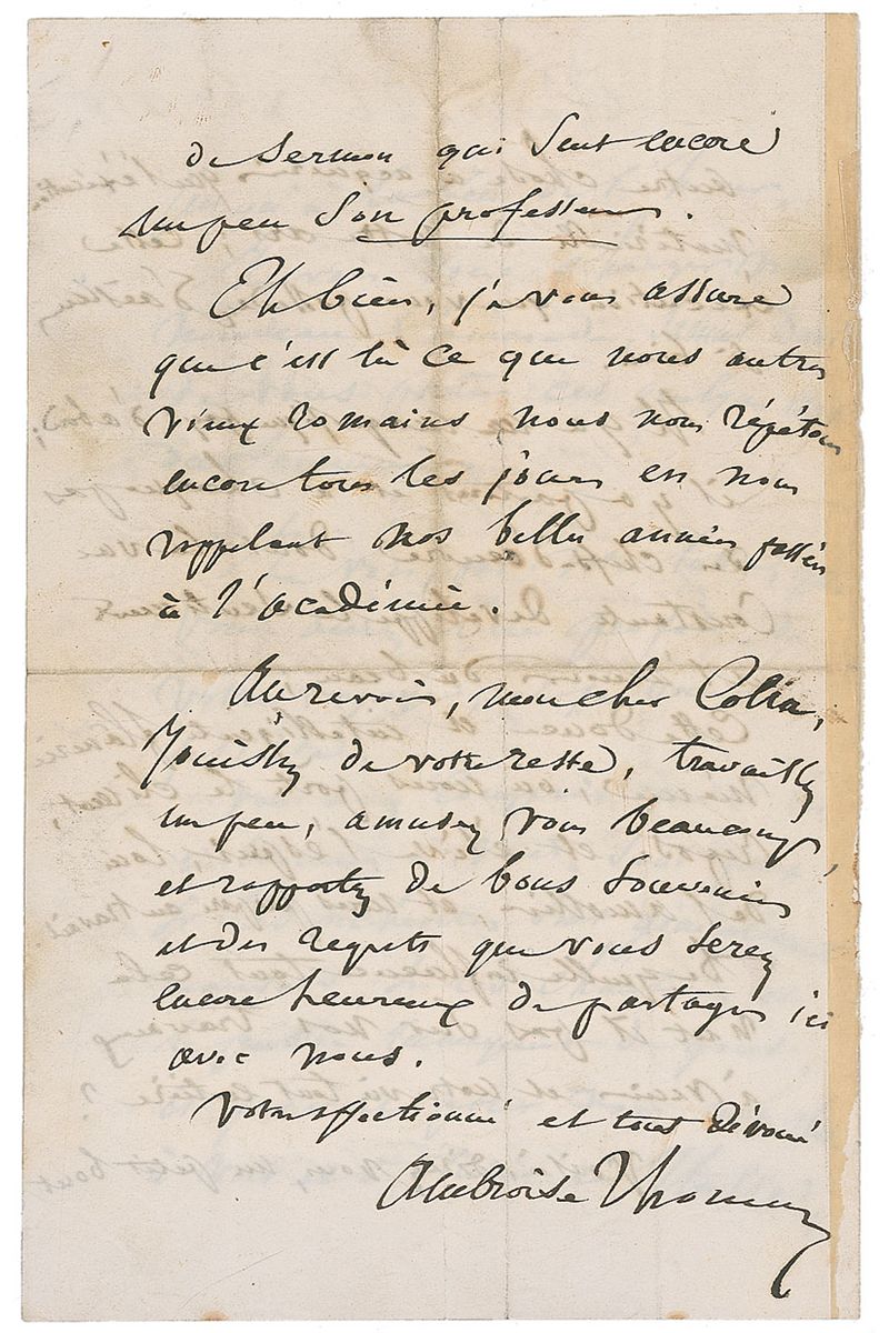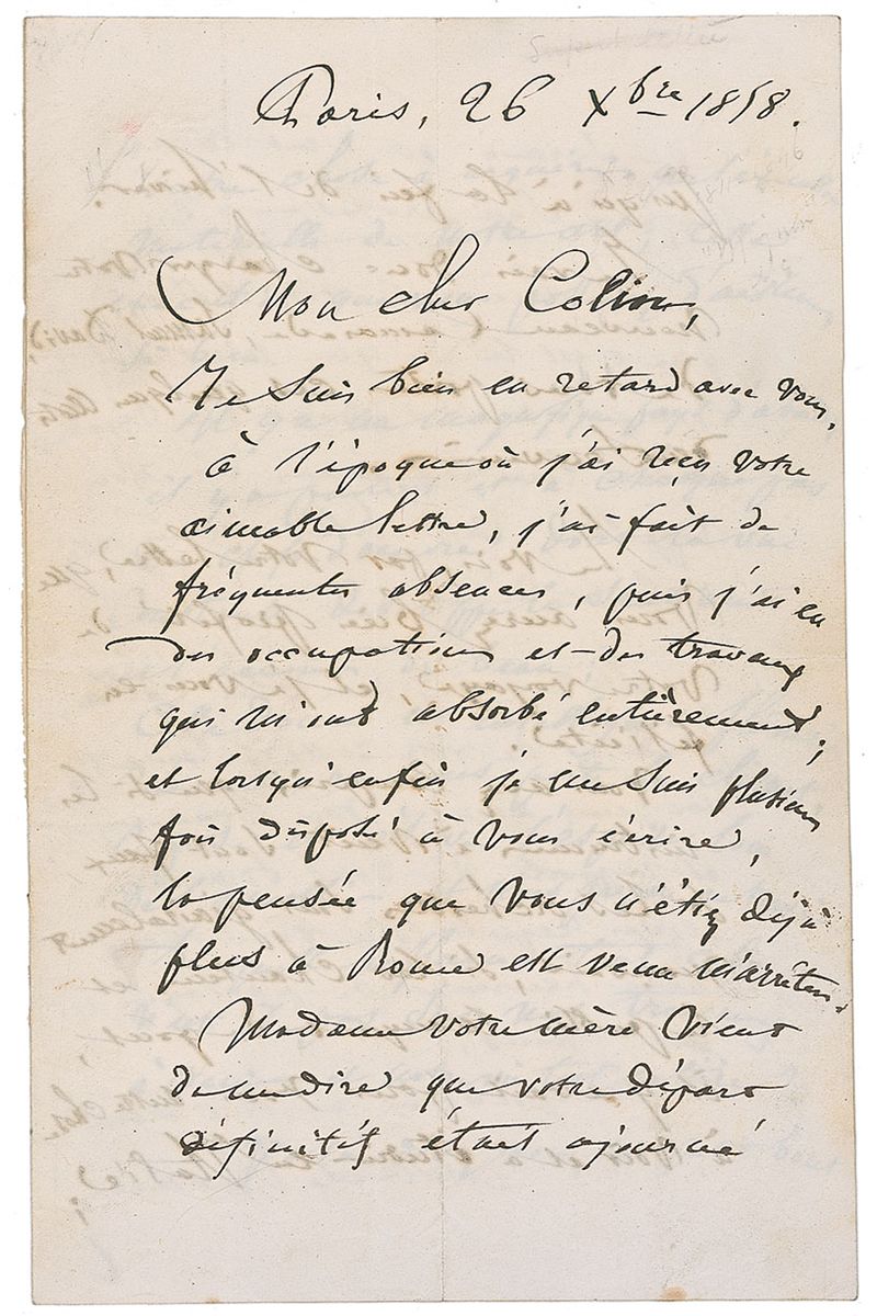 French composer of light operas (1811–1896). ALS in French, four pages on two adjoining sheets, 5.25 x 8, Paris, October 26, 1858. Untranslated letter in French. In very good condition, with intersecting folds (two vertical folds passing through single letters of the signature), some show-through from writing to opposing sides, and mounting remnants to the right border of the final page.