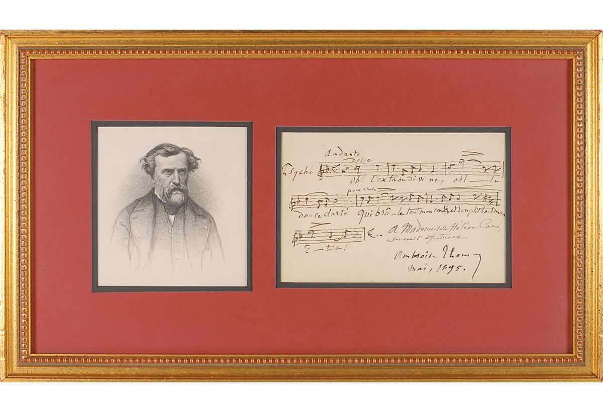 French composer of light operas (1811–1896). Bold AMQS on an off-white 6.75 x 4.5 sheet, May 1895. Thomas pens seven bars of music and lyrics of a melody sung by Psyche, signed and inscribed at the conclusion. Nicely double-matted and framed with an engraved portrait to an overall size of 18.25 x 10.75. In fine condition.