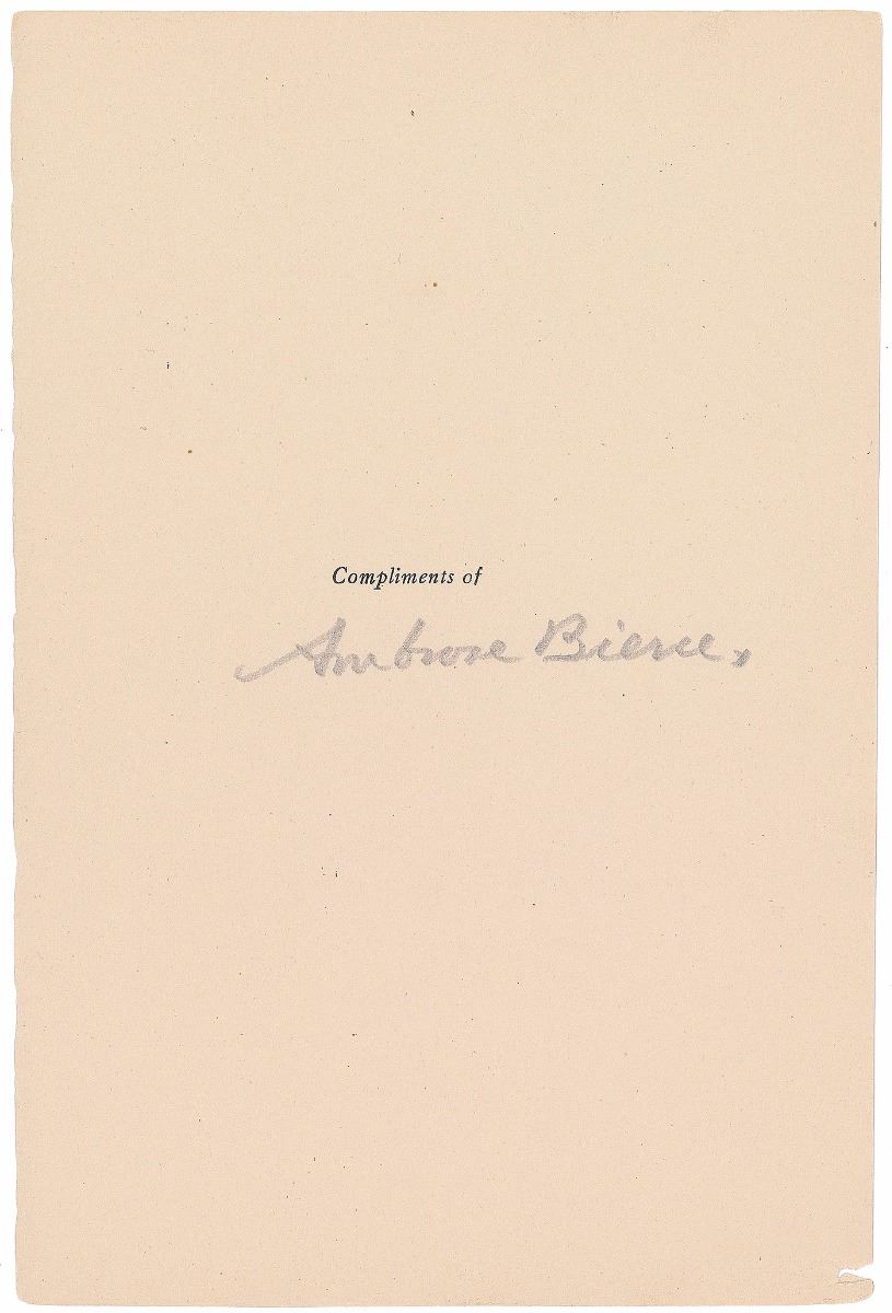 American writer (1842–c.1914) best known for his vivid short stories (including the classic ‘An Occurrence at Owl Creek Bridge’) and his satirical ‘The Devil’s Dictionary.’ In 1913, while traveling with Pancho Villa’s troops during the Mexican Revolution, Bierce disappeared; his ultimate fate remains a mystery. Pencil signature, “Ambrose Bierce.,” on an off-white 6 x 8.75 book page. In fine condition.