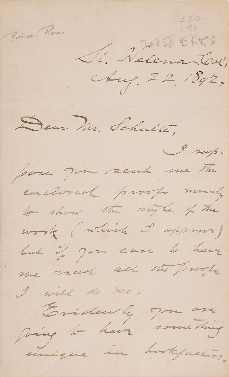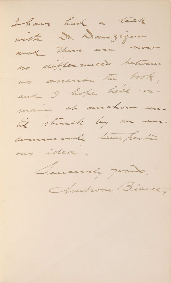 American writer (1842–c.1914) best known for his vivid short stories (including the classic ‘An Occurrence at Owl Creek Bridge’) and his satirical ‘The Devil’s Dictionary.’ In 1913, while traveling with Pancho Villa’s troops during the Mexican Revolution, Bierce disappeared; his ultimate fate remains a mystery. ALS, two pages on two adjoining sheets, 4.75 x 7.75, August 22, 1892. Letter to his publisher, F. J. Schulte, in full: "I suppose you sent me the enclosed proofs merely to show the style of the work (which I approve) but if you care to have me read all the proofs I will do so. Evidently you are going to have something unique in bookfacture. I have had a talk with Dr. Danziger and there are now no differences between us anent the book, and I hope he'll remain at anchor until struck by an uncommonly tempestuous idea." In fine condition. The work in question is 1892's The Monk and the Hangman's Daughter, which was the only novel collaborated on with author Adolphe Danziger. Pre-certified PSA/DNA.