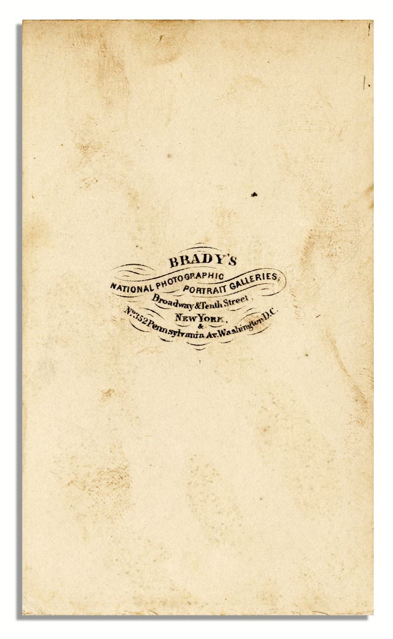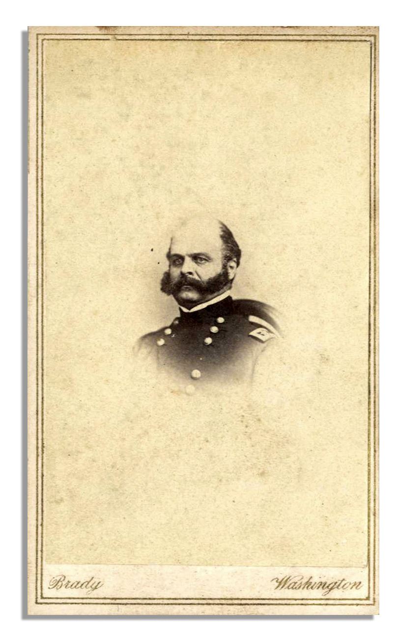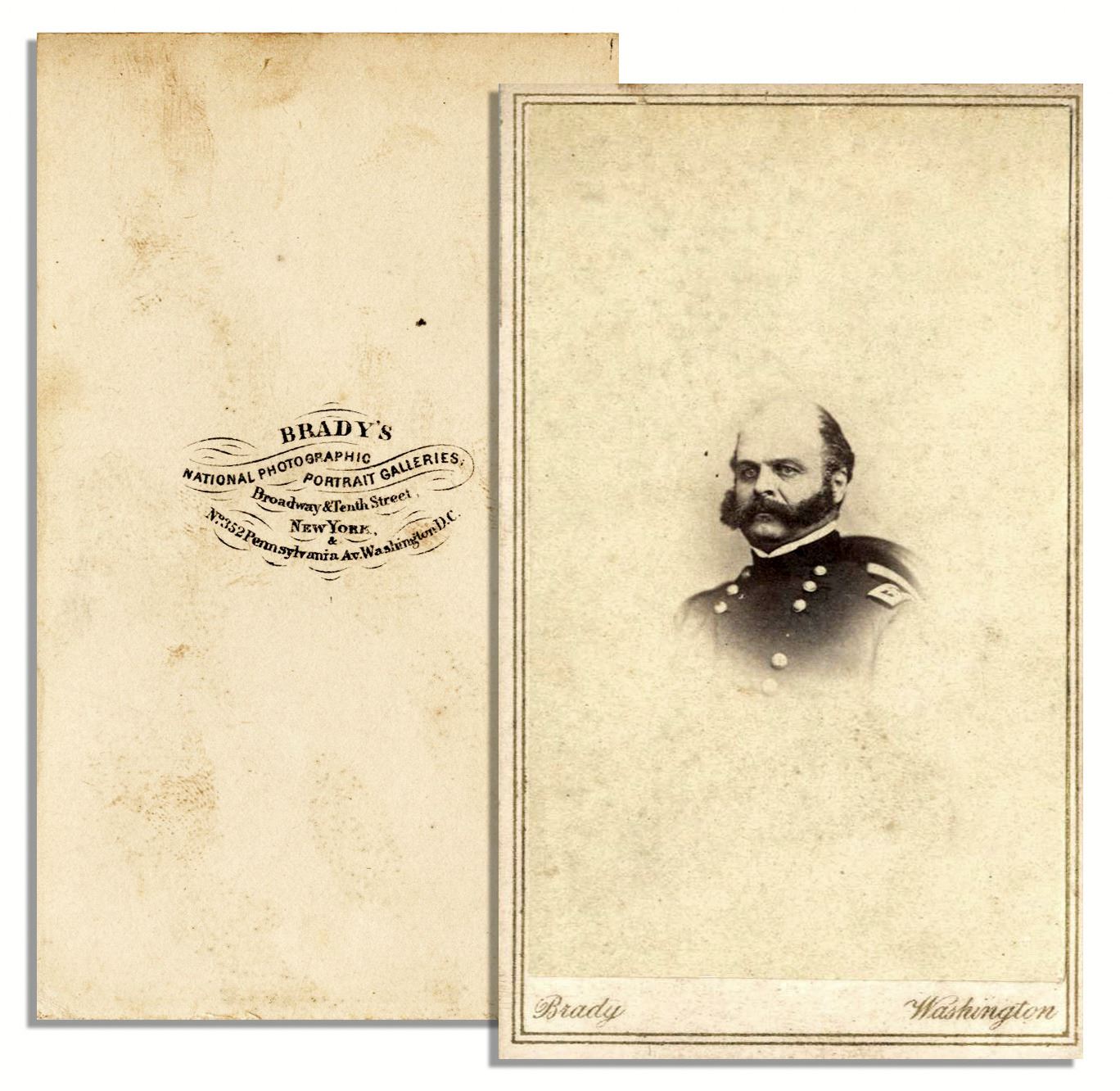 Union General Ambrose Burnside carte de visite, posed in uniform. Taken by Civil War photographer Mathew Brady's studio, CDV has Brady backstamp and ''Brady's Washington'' printed on front. Minor toning, in very good condition.