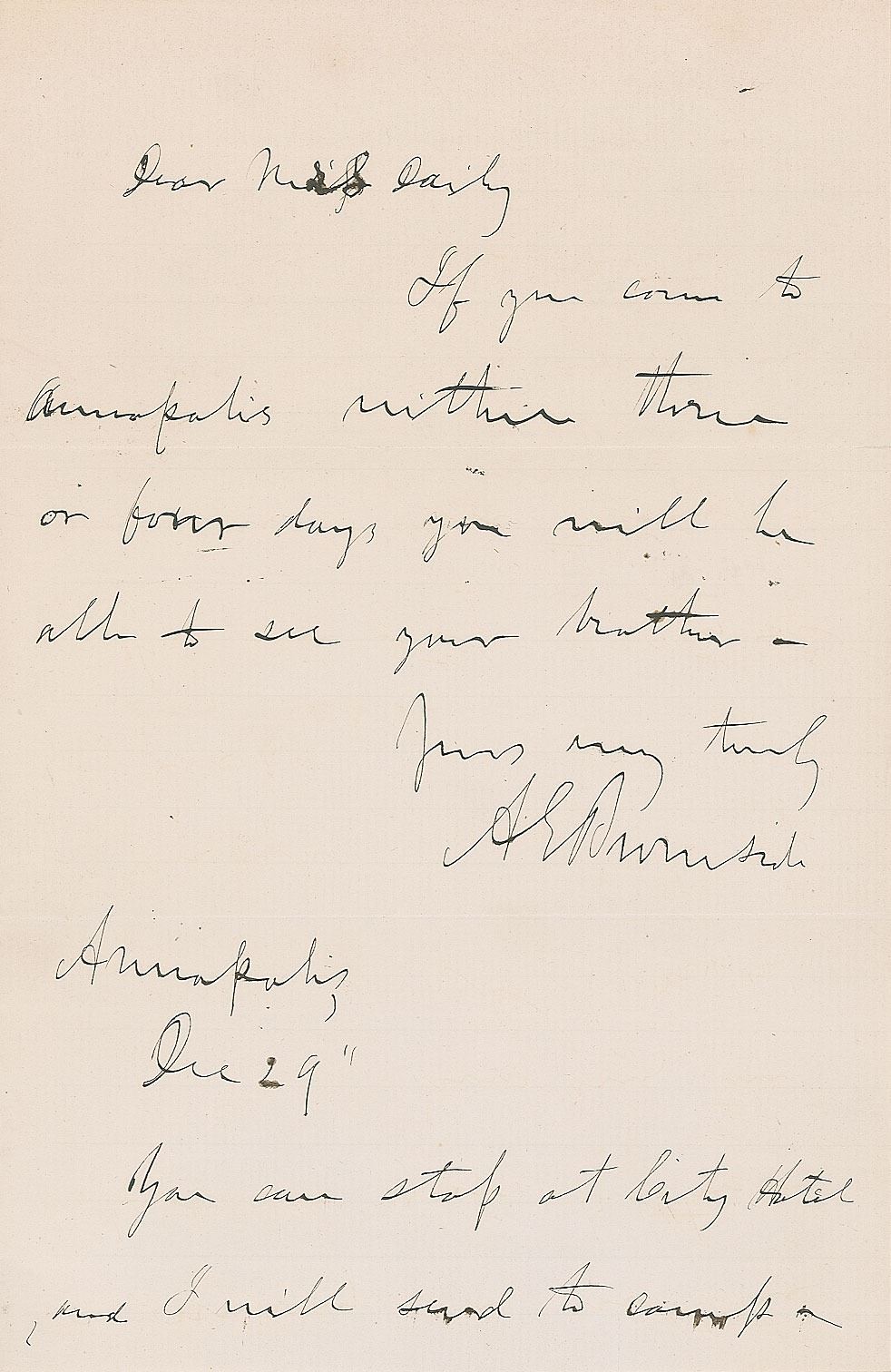 ALS signed “A. E. Burnside,” one page, 5.25 x 8, December 29, no year but likely war-dated, between 1862 and 1864. Written from Annapolis, a letter to the sister of one of Burnside's soldiers, in full: "If you come to Annapolis within three or four days you will be able to see our brother." Burnside adds a postscript: "You can stop at City Hotel and I will send to camp." In fine condition. Accompanied by an engraving of Burnside bearing a preprinted signature.