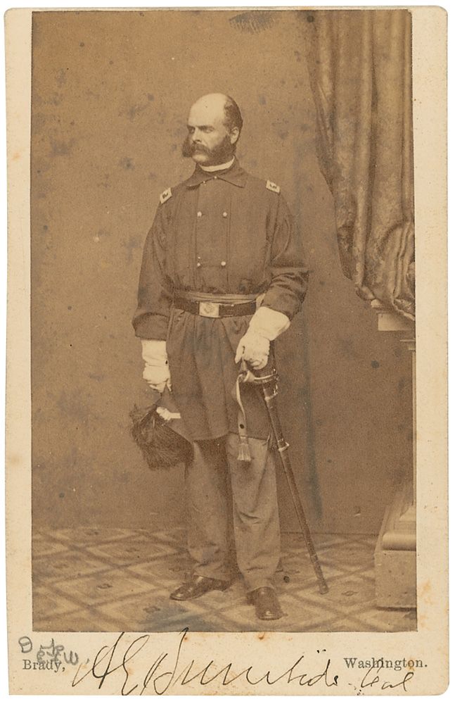 Union general and onetime commander of the Army of the Potomac (1824–1881); the distinctive whiskers he sported gave rise to the word ‘sideburns.’ Original 2.5 x 3.75 carte-de-visite full-length portrait of Burnside in uniform, by Brady of Washington, signed in the lower border in black ink, “A. E. Burnside, Gnl.” In very good condition, with scattered surface marks and light soiling, mild silvering to dark areas of the image, trimmed edges, and a small pencil notation to the lower left.