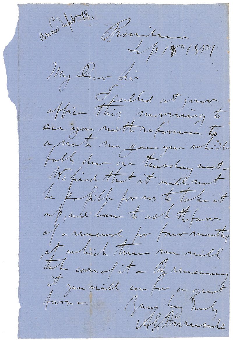 ALS signed “A. E. Burnside,” one page, 5 x 8, September 18, 1857. Letter to an unidentified gentleman. In full: “I called at your office this morning to see you with reference to a note we gave you which falls due on Tuesday next. We find that it will not be possible for us to take it up and have to ask the favor of a renewal for four months at which time we will take care of it—By receiving it you will confer a great favor.” In very good condition, with intersecting folds, one through a single letter of signature, some scattered light toning, and an office notation to top left.