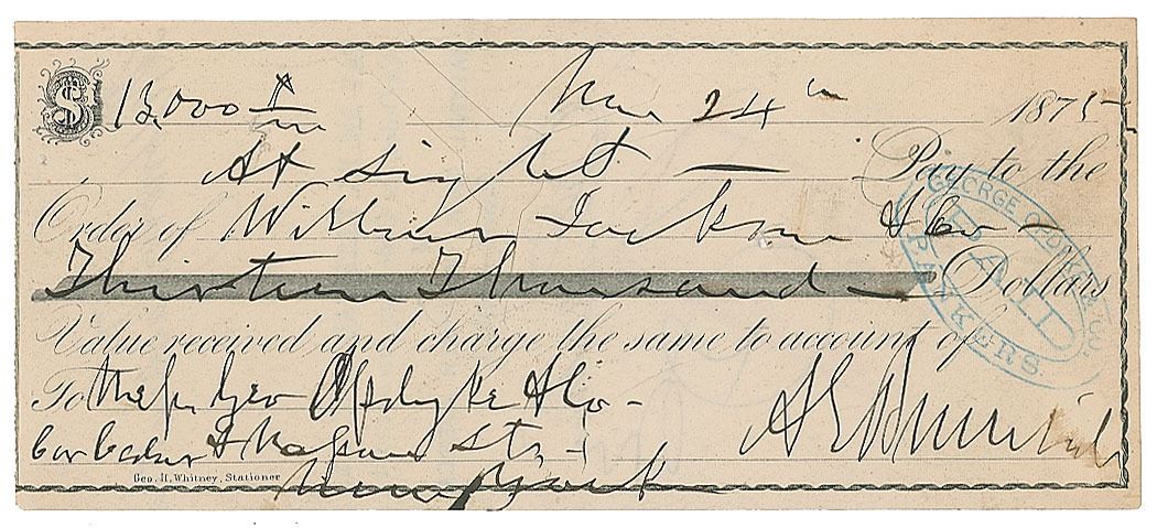 Bank check, 6.5 x 3, filled out and signed by Burnside, "A. E. Burnside," payable to Wilbur Jackson for $13,000, March 24, 1875. In fine condition.