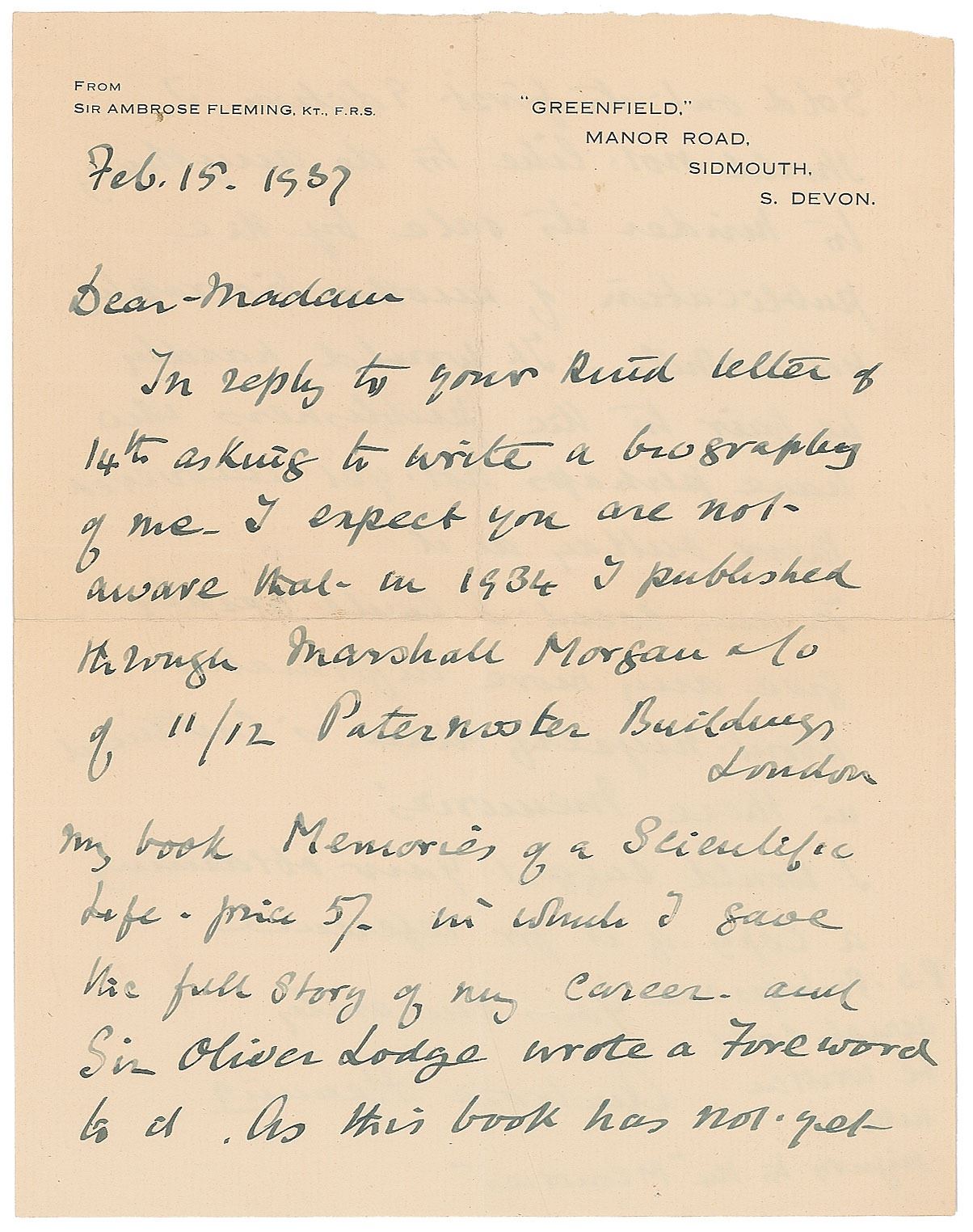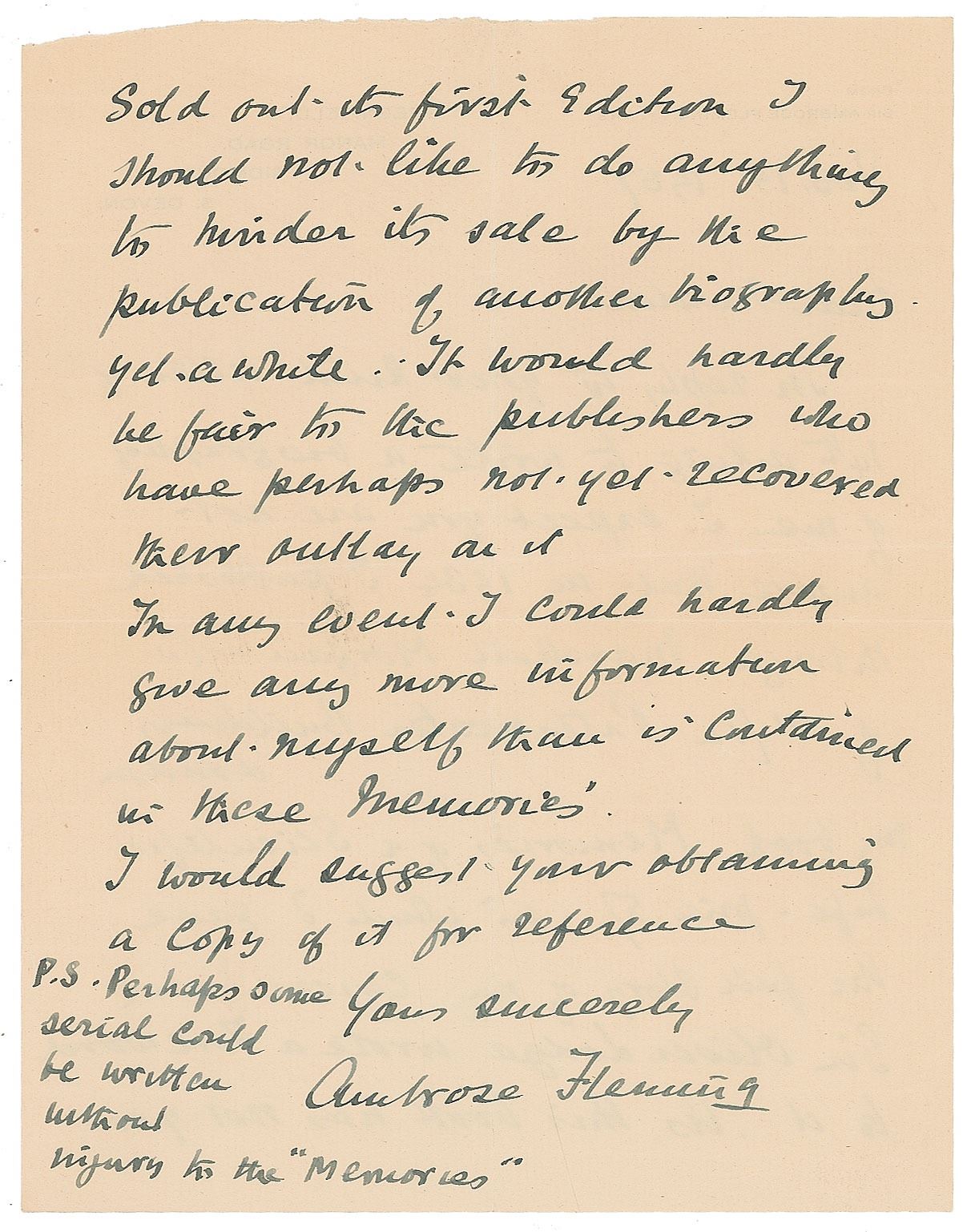 ALS, one page both sides, 7 x 9, Greenfield letterhead, February 15, 1937. Letter responding to a request to write his biography, in part: "In reply to your kind letter of 14th asking to write a biography of me—I expect you are not aware that in 1934 I published through Marshall Morgan & Co…my book Memories of a Scientific Life…in which I gave the full story of my career, and Sir Oliver Lodge wrote a Foreword to it. As this book has not yet sold out its first Edition I should not like to do anything to hinder its sale by the publication of another biography…It would hardly be fair to the publishers who have perhaps not yet recovered their outlay on it. In any event I could hardly give any more information about myself than is contained in these memories. I would suggest your obtaining a copy of it for reference." He adds a thoughtful postscript, "P.S. Perhaps some serial could be written without injury to the 'Memories.'" In fine condition. Oliver Lodge was a fellow physicist who was also involved in the development of wireless telegraphy.