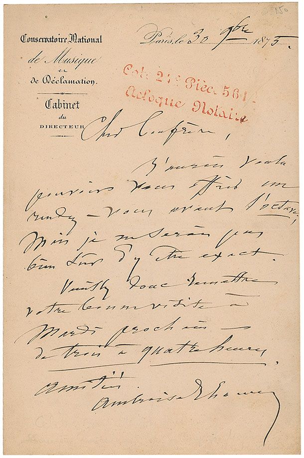 French composer of light operas (1811–1896). ALS in French, one page, 5.25 x 8, Conservatoire National de Musique letterhead, October 30, 1875. Untranslated letter. In very good condition, with scattered toning and soiling, an office stamp near top, and a couple small pencil notations and creases.