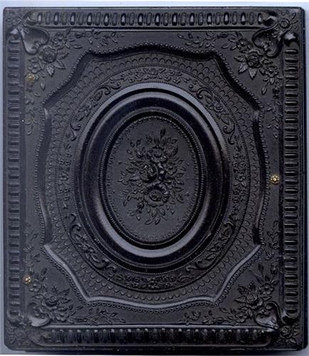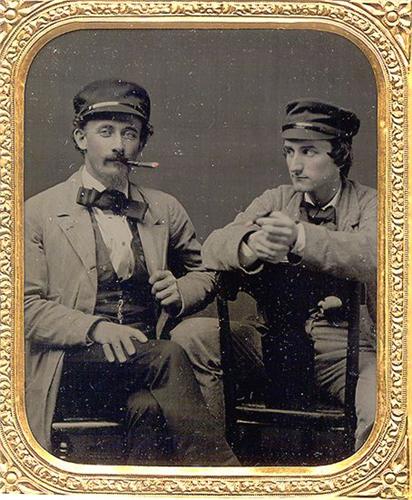 The guy on the left smokes a cigar with a red tip. A slip identifies them. 1/6 ambrotype on ruby glass [4] held to mat with original paper tape, in excellent thermoplastic case, "Three Roses in an Oval" [Berg 2 - 48]. It’s excellent but for 2 small nicks at rail edges, so [D4-]