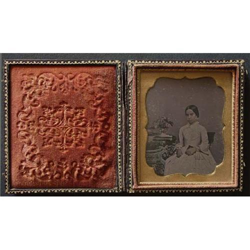 Ambrotype or Daguerreotype of a school girl posing by a table with a bouquet of flowers and books, and holding a book on her lap. She is wearing a white dress and has a wide ribbon attached to her wrist. Comes in a complete leather case lined in rust colored velvet and is surrounded by a gold passepartout. In good condition, leather rip on edge of case. Please ask questions, request additional photos and shipping costs before bidding.