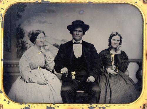 WIVES. The women have what seems to be pipe stems in their mouths, and they hold the bowls in their laps. Many details are gilded. It has been suggested that this could be Mormon family, but that is just a conjecture. 1/2 plate ambrotype, sealed to backing glass, in separated case. [3]