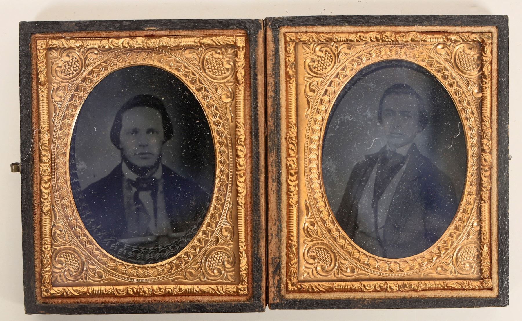 A duo of Ambrotype photographs of two gentlemen, c1850s-60s. Gold gilt mats. Each on an identical half case, no hinges or clasps. Nice pair. Both 2.25" x 2.75" x .25".
