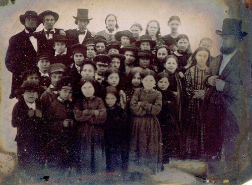 4 men and 1 woman teacher flank this large group of young students. This 1/4 plate horizontal ambrotype is not a technical masterpiece, but it is in its own way quite wonderful. The students, many of them wearing hats and caps, are individually quite appealing, particularly the endearing group in the front left. Tarnish at right. In separated case. [2+]