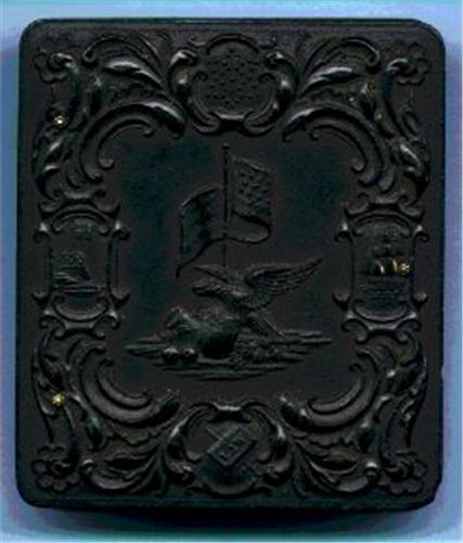 Ambrotype under Glass. C. 1864, showing man and woman seated, the woman swathed in veil, wearing hoop skirt. Abrasion at upper right in background only, not affecting image. Dark green embossed velvet facing. In magnificent Union case, flag and eagle on front, rings and arrows on back, with wide ornamental border. Very fine.