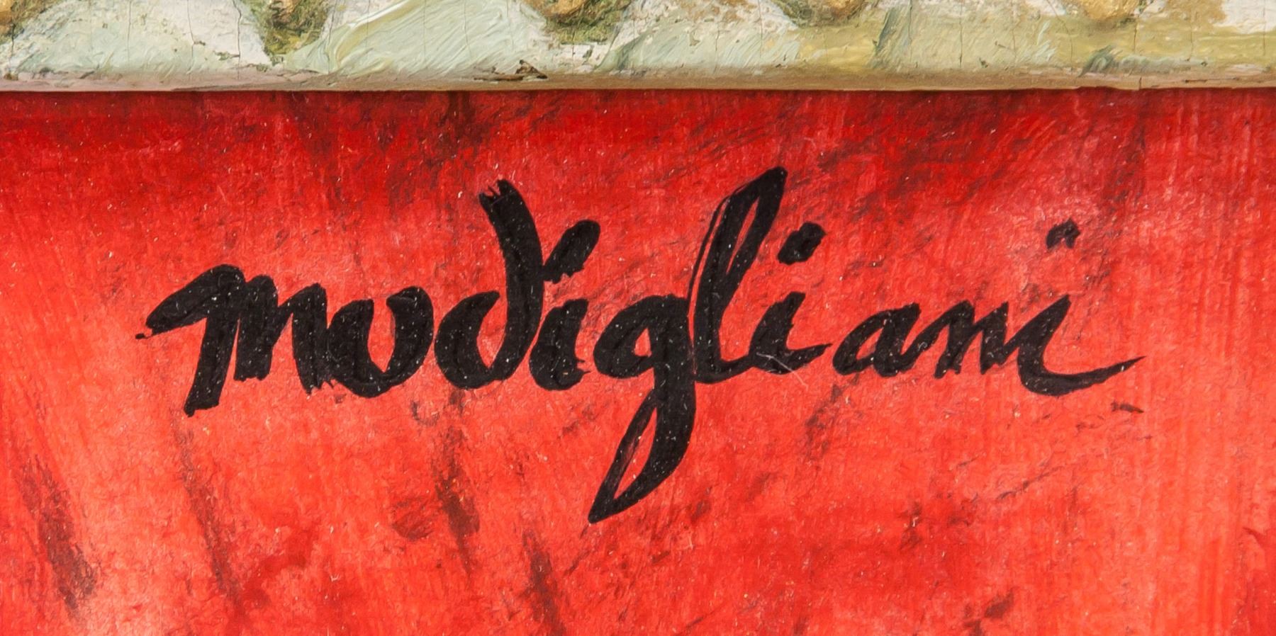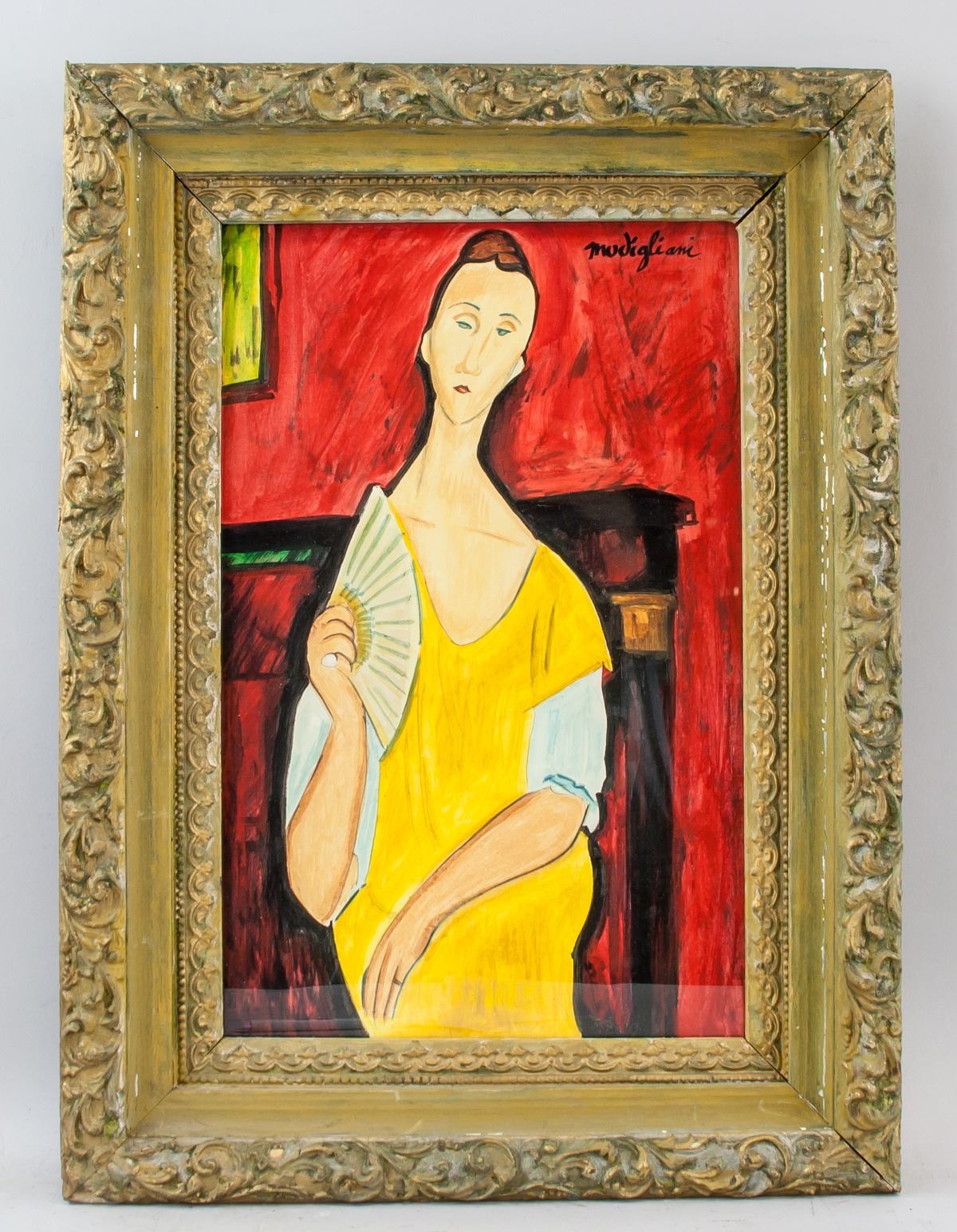 Gouache on paper, framed, featuring seated lady with fan, signed Modigliani on the upper right corner. Attributed to Amedeo Modigliani (Italian, 1884-1920) 36.5 x 33 cm (14.4 x 13 inches), frame: 50 x 37 cm (19.7 x 14.6 inches). PROVENANCE: Southern Ontario estate