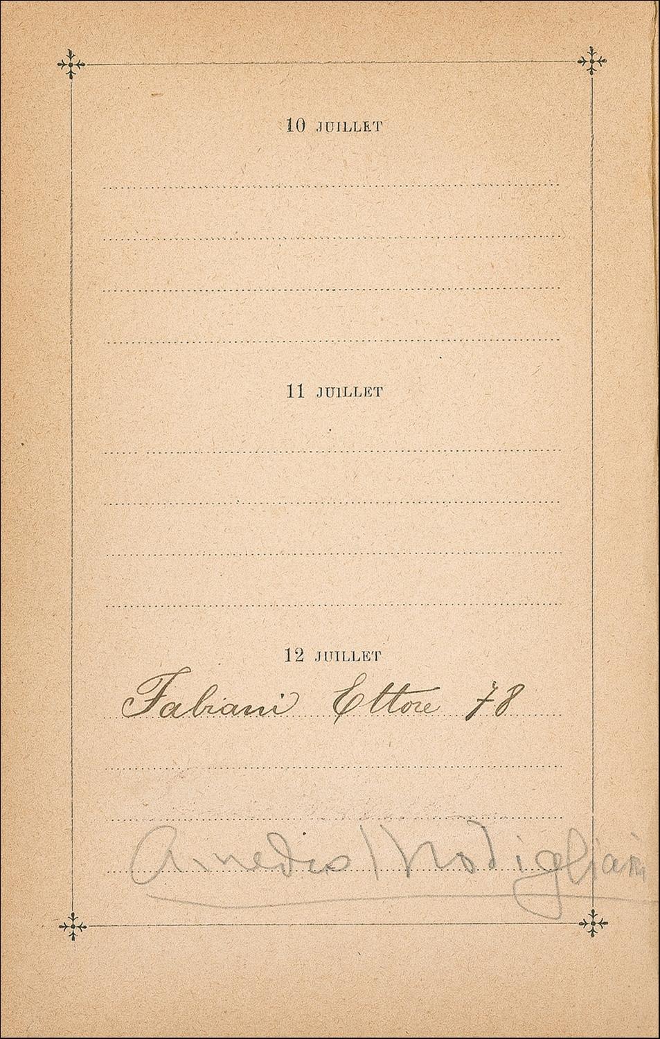 Painter and sculptor (1884–1920) who had to struggle against poverty and chronic ill health, dying of tuberculosis and excesses of drink and drugs at the age of 35. Signed book: Memini: Album Poetique. Paris: Delachaux and Niestle. Hardcover, 4.25 x 6.25. Signed inside in pencil on the July 12th entry, his birthdate, “Amedeo Modigliani.” Book is also signed inside in ink or pencil by some of Modigliani’s family and friends, and also bears a 1980 attestation of authenticity by Renato Saggiori on the second free end page. Mild uniform toning to all pages, several other small notations to opening pages, small label affixed to inside opening page, tape reinforcement along front hinge, light wear to boards and spine, and some light fraying to head and tail of spine, otherwise fine condition.