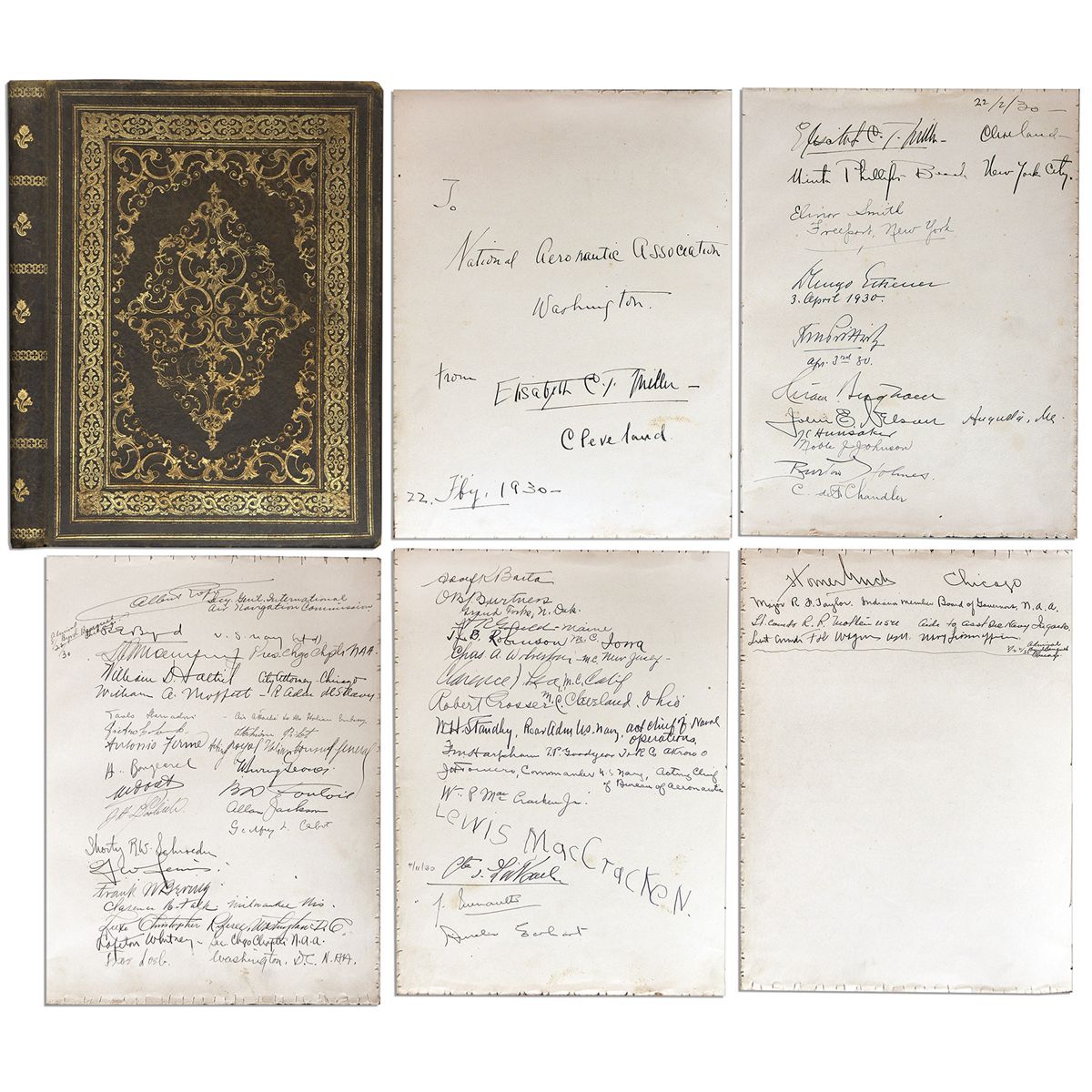 Guestbook from the National Aeronautic Association's 1930 conference signed by 27 aviation pioneers. The NAA was founded in 1905 and remains an active organization, keeping aeronautical records and supporting air sports. Signatures comprise: Amelia Earhart, woman stunt pilot Elinor Smith, Admiral Wiliam Harrison Standley, airship commander Hugo Eckener, admiral John Henry Towers, explorer Hiram Bingham III, William P. MacCracken Jr., Jerome Clarke Hunsaker, Noble Johnson, travel lecturer Burton Holmes, Rear Admiral Richard E. Byrd, C de F Chandler, U.S. Navy aviation advocate William A. Moffett, J.H. Doolittle, R.W. ''Shorty'' Schroeder, Congressman Clarence Lea, George W. Lewis, who served as Director of Aeronautical Research at the National Advisory Committee for Aeronautics, Luke Christopher, Geoffrey L. Cabot and B.D. Foulois, who flew with the Wright Brothers. Signatures appear on the first three sheets (including front free endpaper) of a handsome brown leather bound book with allover gilt design and plain leaves. Measures 9'' x 11.75''. Leather loss to board corners and warping to front board. Very good overall with immaculate interior.