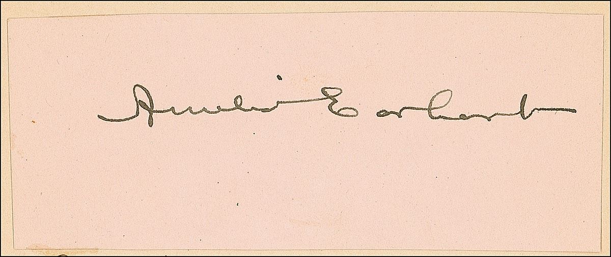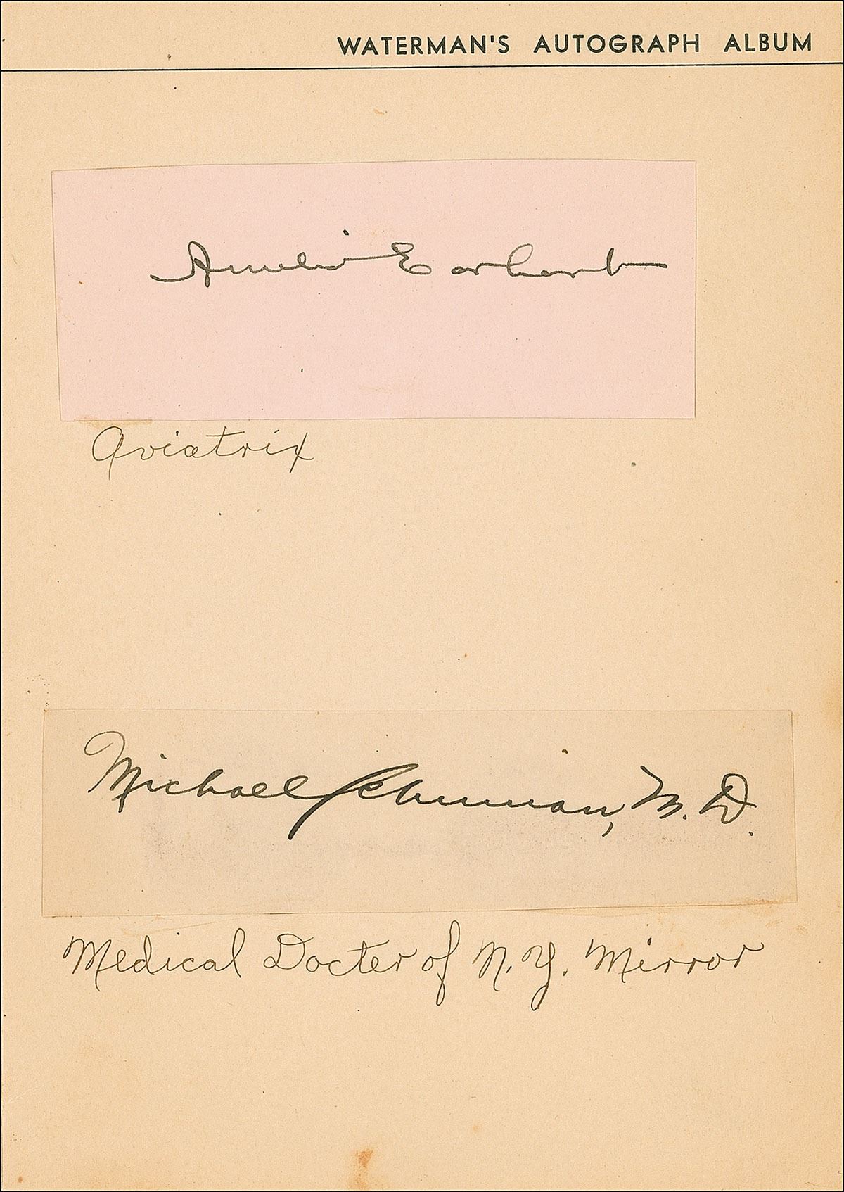 Fountain pen signature, “Amelia Earhart,” on a pink 3.75 x 1.5 slip affixed inside a vintage 5 x 7.25 Waterman’s autograph album, which also contains affixed signatures of Mary Pickford, Gene Sarazen, Fay King, Sylvia Sidney, Kate Smith, Helen Hicks, Zane Grey, and others; includes facsimile signatures of Lupe Velez and Franklin D. Roosevelt. Also inserted loosely in the book is a TLS signed by Eleanor Roosevelt. In fine condition. Accompanied by a full letter of authenticity from PSA/DNA.