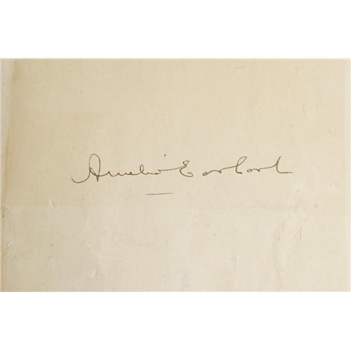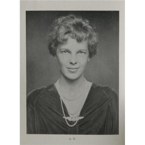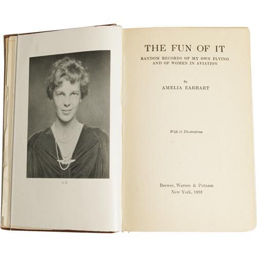 <B>Amelia Earhart Signed Book:<I> The Fun Of It.</B></I></B></I> (New York: Brewer, Warren & Putnam, 1932), first edition, 218 pages, 31 illustrations, brown cloth, 8vo (5.5" x 8.25"), signed "<I>Amelia Earhart</B></I>" on the free front endpaper. The greatest aviatrix of all time tells her readers very simply why she loves to fly. The book comes with a mini-record of Amelia's broadcast that she made when she landed in London which is affixed to the back cover in a small protective sleeve. The book is in fair condition, with damage to the cover, title print, cracked interior hinges, bumped corners and wear on the edges; several pages are separating from the spine; the spine has come loose from the binding, and the front endpaper with the signature has been taped into the book. It appears to be part of the original book. The mini-record appears to be in fine condition.<BR><BR><b>Shipping:</b> Books & Catalogs (<a target="_blank" href="http://www.heritageauctions.com/common/shipping.php">view shipping information</a>)