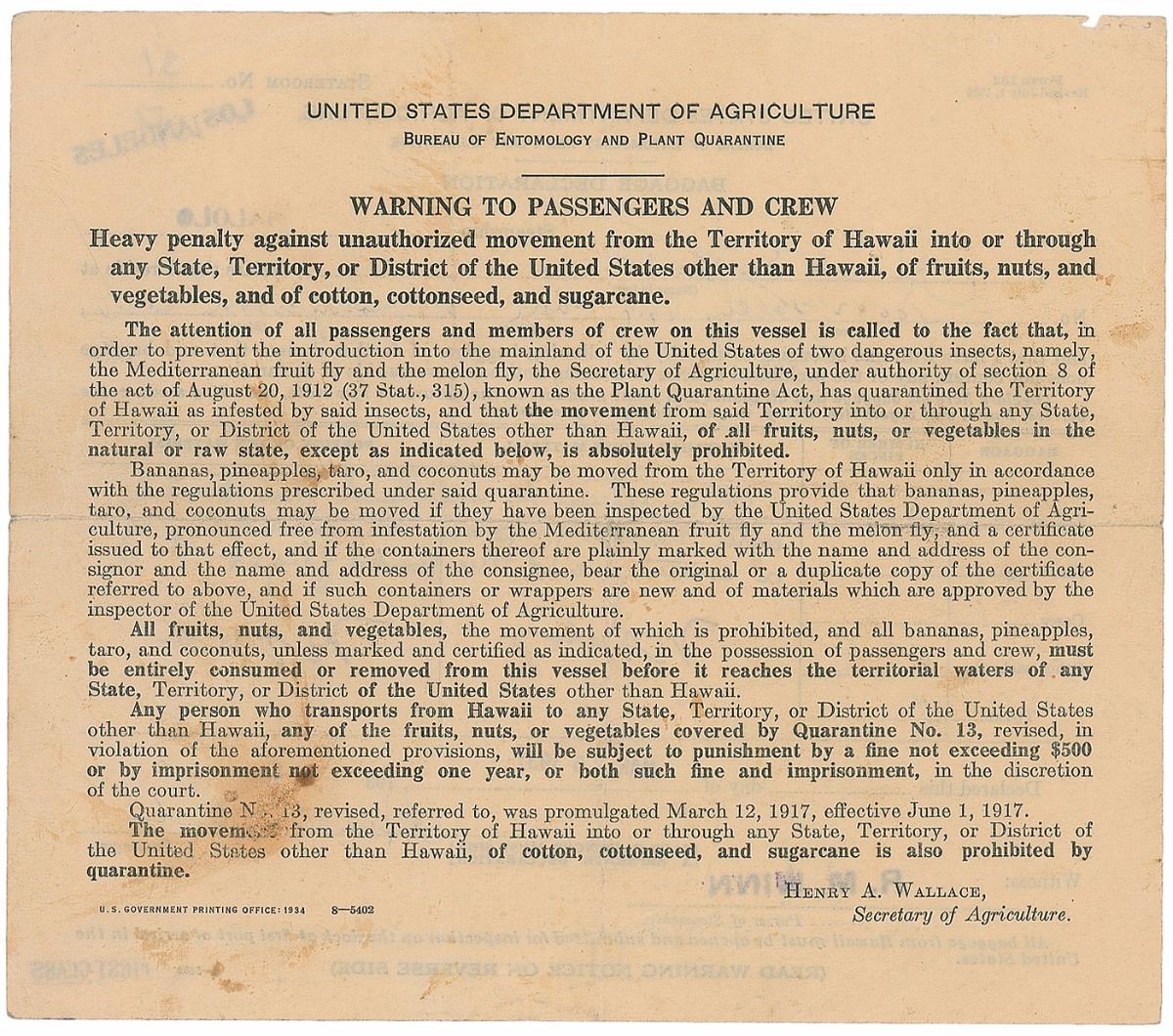 Partly-printed DS, signed twice in pencil, “Amelia Earhart,” one page both sides, 8 x 7, March 25, 1937. United States Department of Agriculture baggage declaration form completed upon returning to Los Angeles Harbor aboard the SS Malalo after her failed first attempt at an around-the-world-flight. The first portion is filled out in Earhart’s hand with her name and address, “Amelia Earhart” and “10042 Valley Spring Lane, N. Hollywood Calif.” She signs again at the conclusion to certify that she has four pieces of luggage and is not carrying any foreign-grown material. A notation in another hand reads, “On her return to mainland from Honolulu after cracking up on the second leg of a westerly round the world flight.” In very good condition, with expected document wear, staple hole to upper left corner, and a small stain affecting a portion of Earhart’s signature at the conclusion.