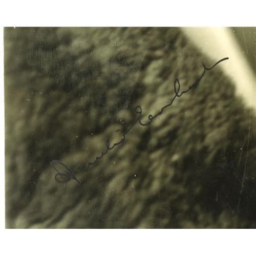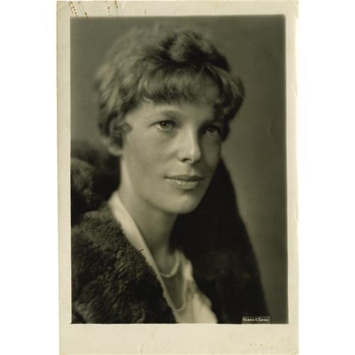 <B>Amelia Earhart Signed Harris & Ewing Photo.</B></I> A stunning 8" x 10" photograph signed "Amelia Earhart" at the lower left corner in dark ink. A very fine example of her signature on a studio portrait. A particularly desirable bust portrait of the world's most famous female aviator dressed in her fur-lined flight jacket. With copyright licensing stamp on verso. A pilot, Earhart in 1928, was the first woman to cross the Atlantic in an airplane. In 1932, she became the first woman to fly solo across the Atlantic, and in 1935, she duplicated that feat with the Pacific Ocean. In 1937, she attempted an around-the-world flight with her navigator Fred Noonan, but disappeared near Rowland Island in the South Pacific. Several relatively minor creases, two paperclip marks at upper left margin, and one small marginal tear do not detract from this arresting image. An excellent portrait worthy of restoration but is very displayable as it is.<BR><BR><b>Shipping:</b> Books & Catalogs (<a target="_blank" href="http://www.heritageauctions.com/common/shipping.php">view shipping information</a>)
