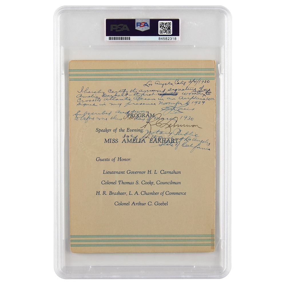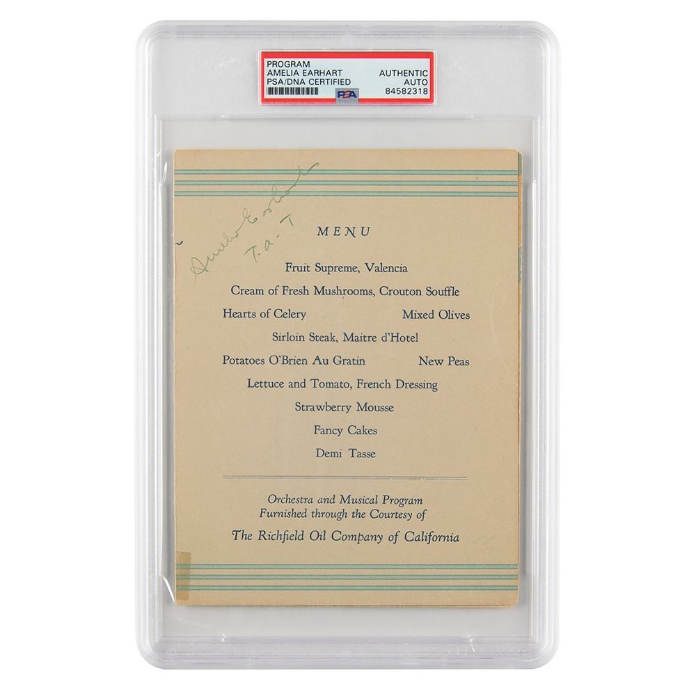 Program for a dinner organized by the Women's Traffic Club of Los Angeles in honor of Amelia Earhart, held at the Alexandria Hotel on November 8, 1929, 5.5 x 7.25, signed inside on the menu in fountain pen, "Amelia Earhart, T.A.T." The opposite side bears a notary stamp and signature, and handwritten notations stating that the program was signed on the date of the dinner. In fine condition, with a small piece of tape to a lower corner. Encapsulated in a PSA/DNA authentication holder.